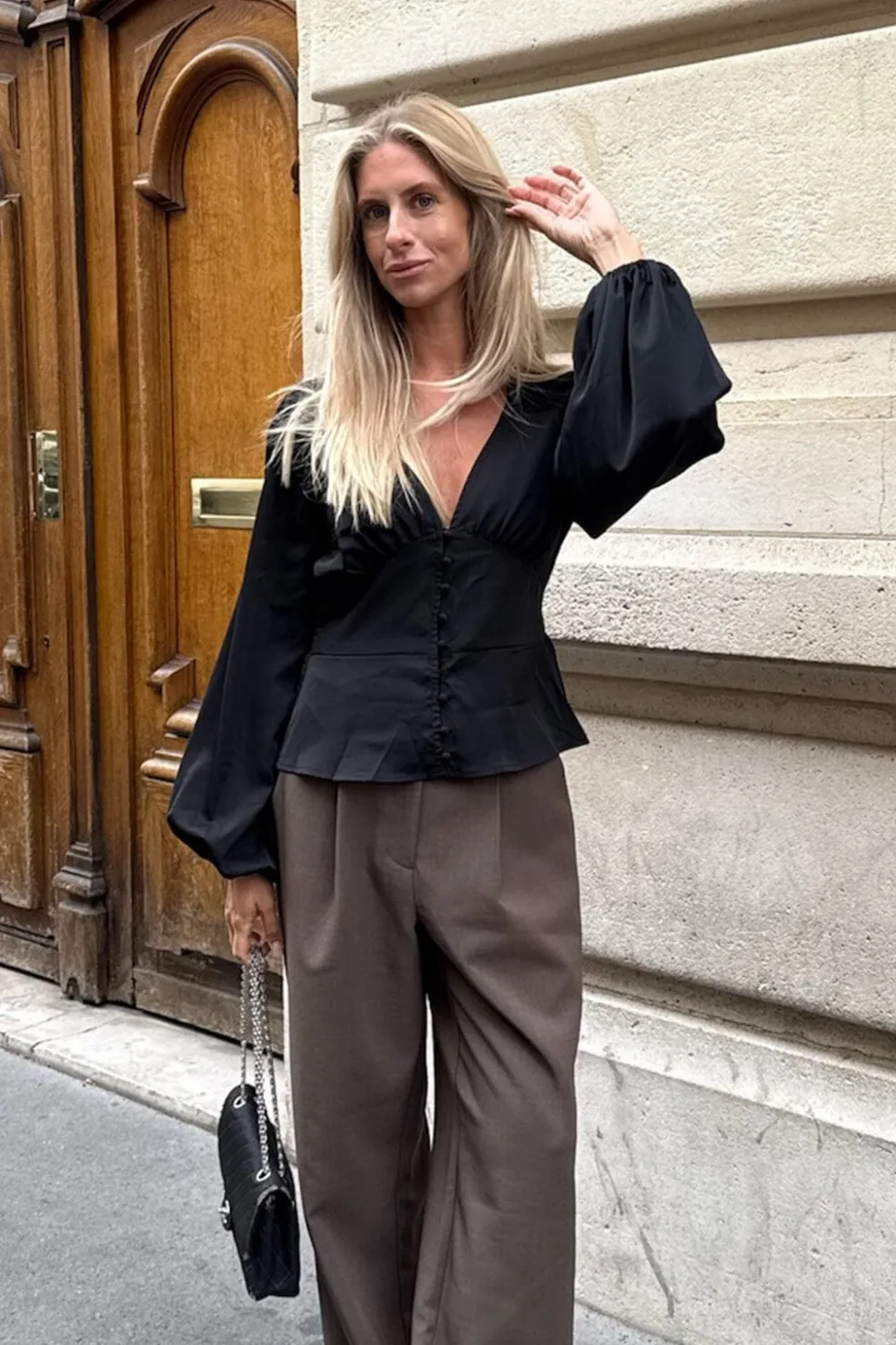 Sort skjorte fra BYIC med V-udskæring og flæsedetaljer. Skjorten har en tætsiddende silhuet og lange ærmer med elastik ved manchetterne.