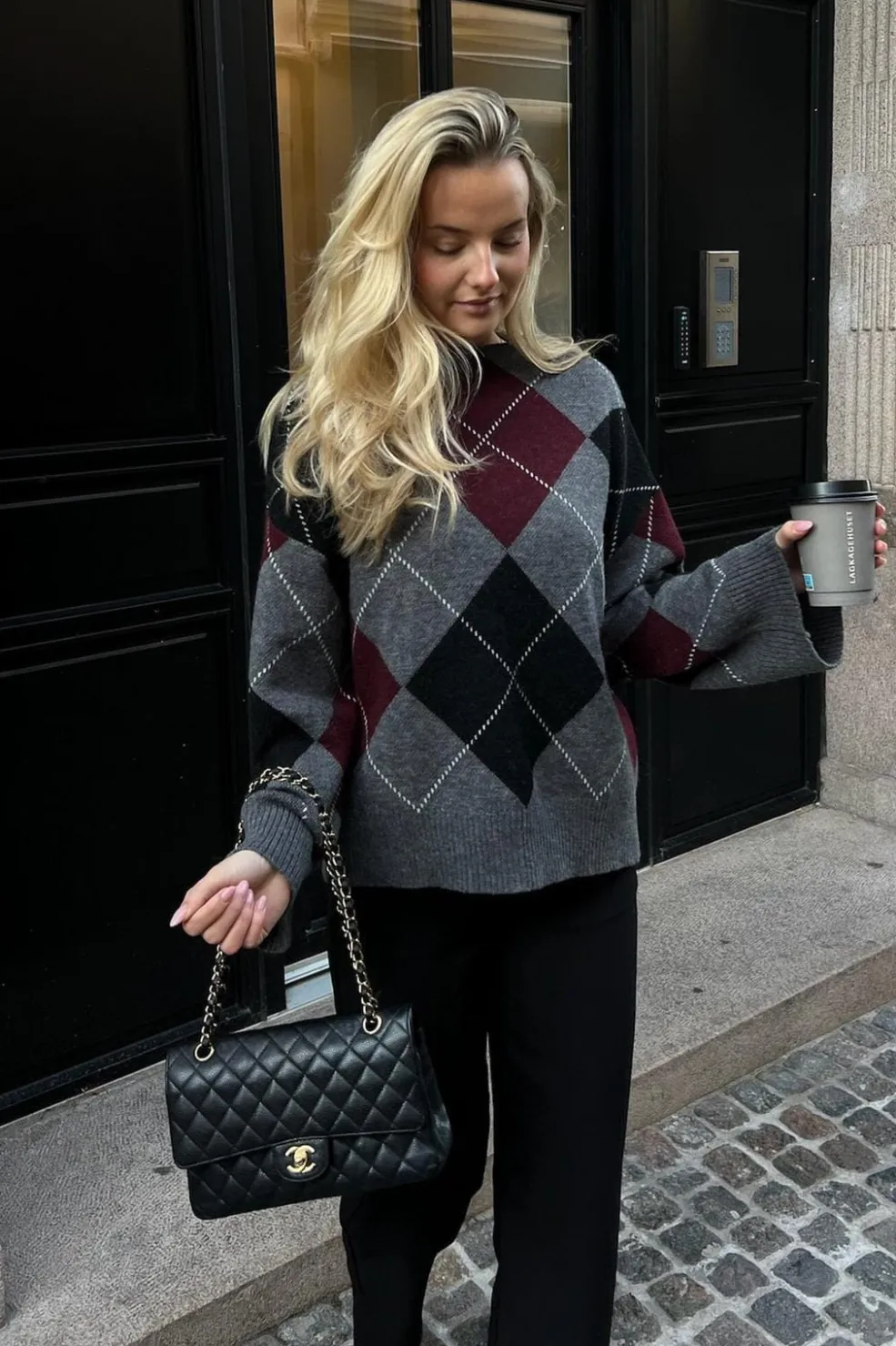 Pullover fra BYIC med argyle-mønster i grå, sort og bordeaux. Den har en løs, boxy pasform med rund halsudskæring og lange ærmer.