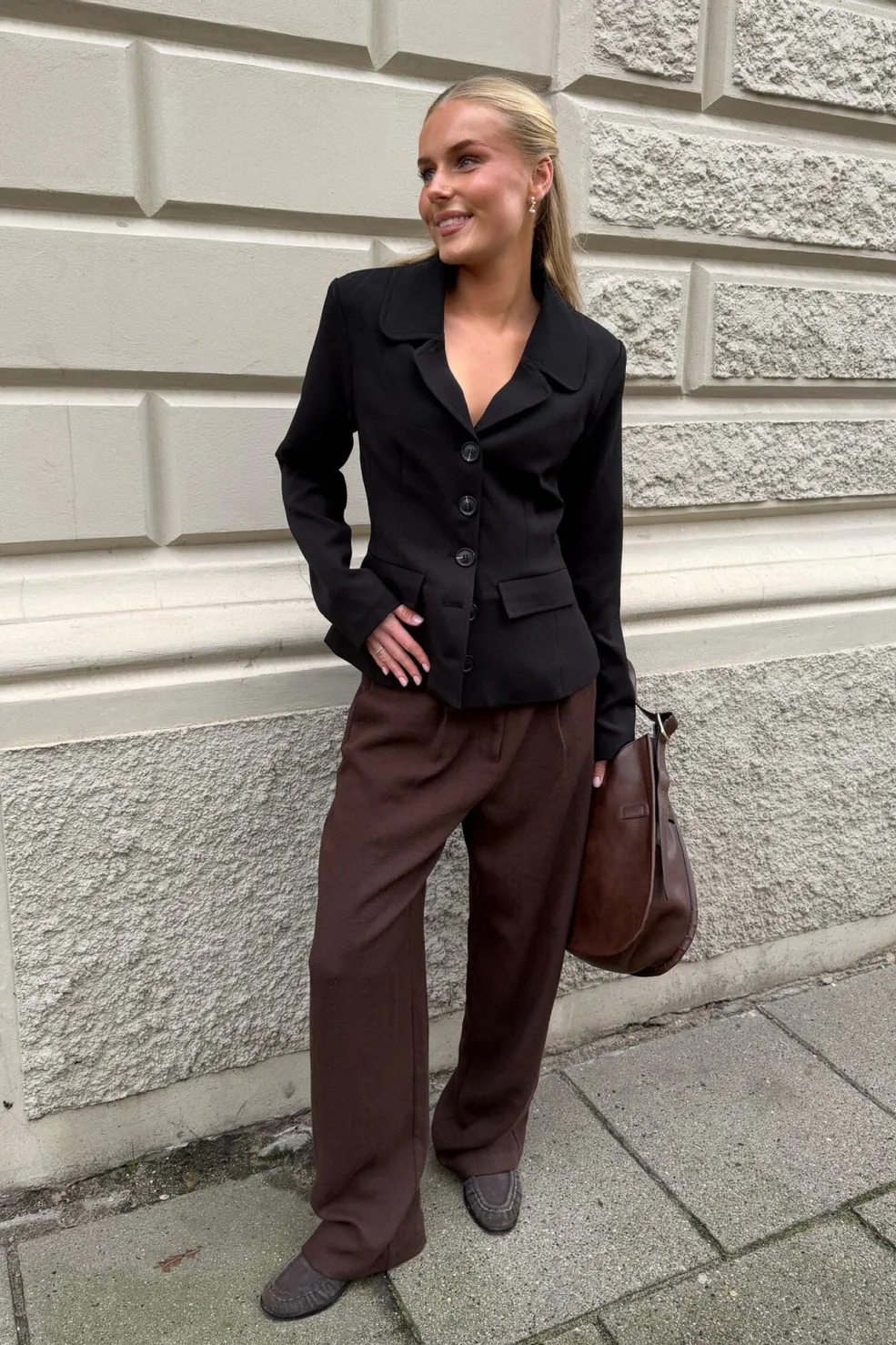 Sort blazer fra BYIC med slim fit-snit. Blazeren har klassisk skjortekrave, knapper i naturfarver og to klaplommer foran. Det strukturerede stof giver en markeret talje.