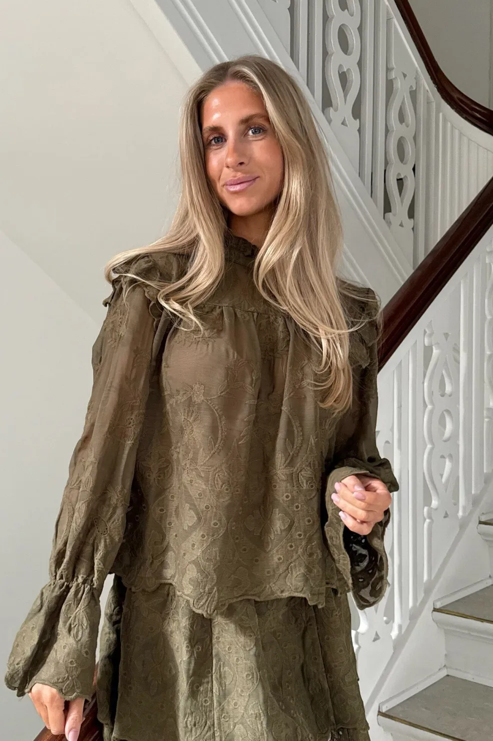 Blondeskjorte i vintage olive fra BYIC med gennemsigtig blonde og blomstermønster. Den høje hals og de lange ærmer har flæsedetaljer, og skjorten består af flere lag stof.