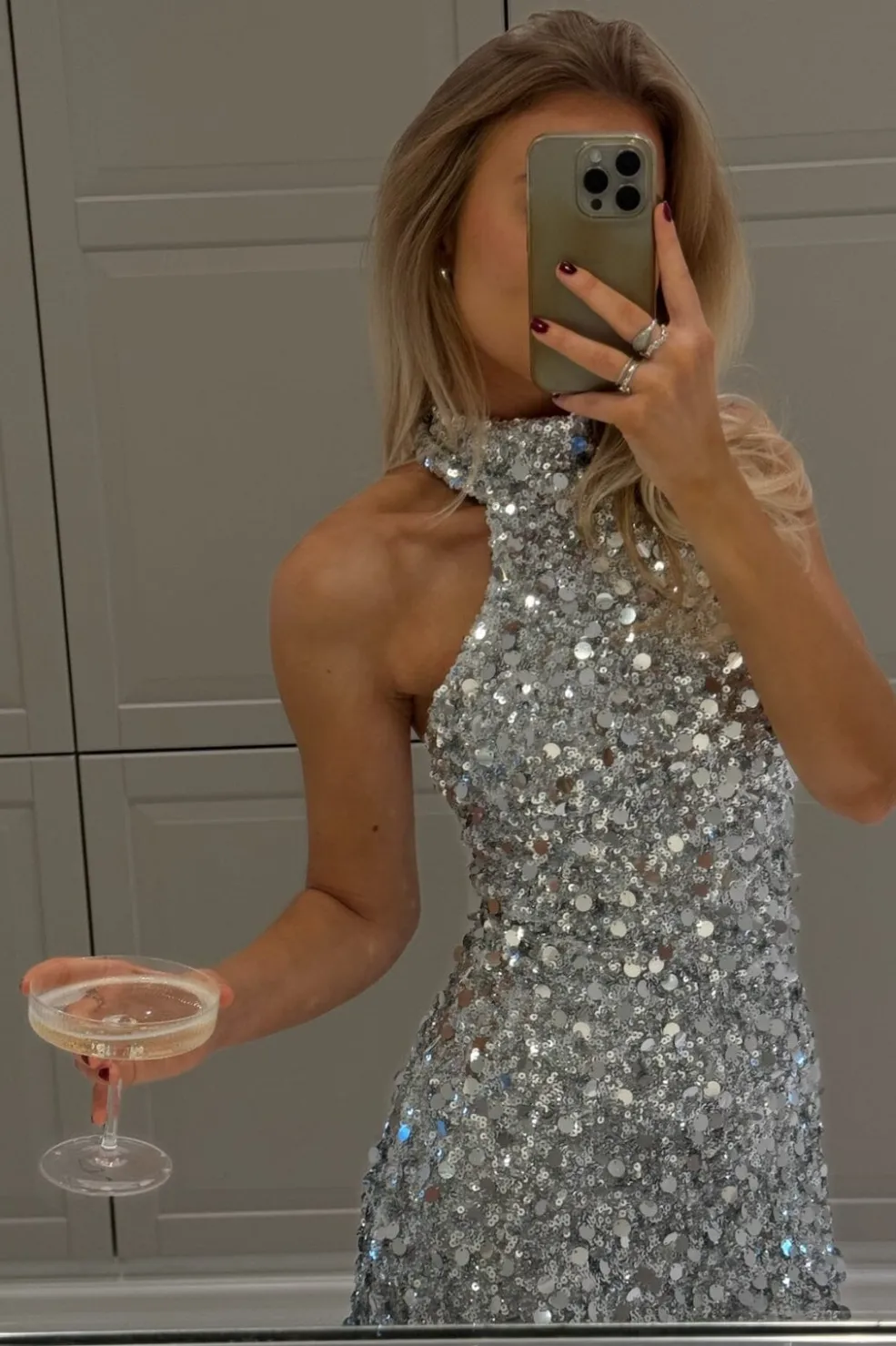 Sølvfarvet minikjole fra BYIC med pailletter over hele kjolen. Den høje hals og det ærmeløse design giver kjolen et rent snit, mens pailletterne skaber et skinnende udtryk.