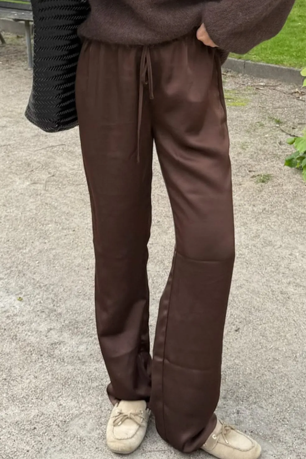 Mørkebrune bukser fra BYIC i blank satin med løs pasform. Bukserne har snørelukning og elastik i taljen, hvilket gør dem nemme at justere. De kan styles til både hverdag og fest.