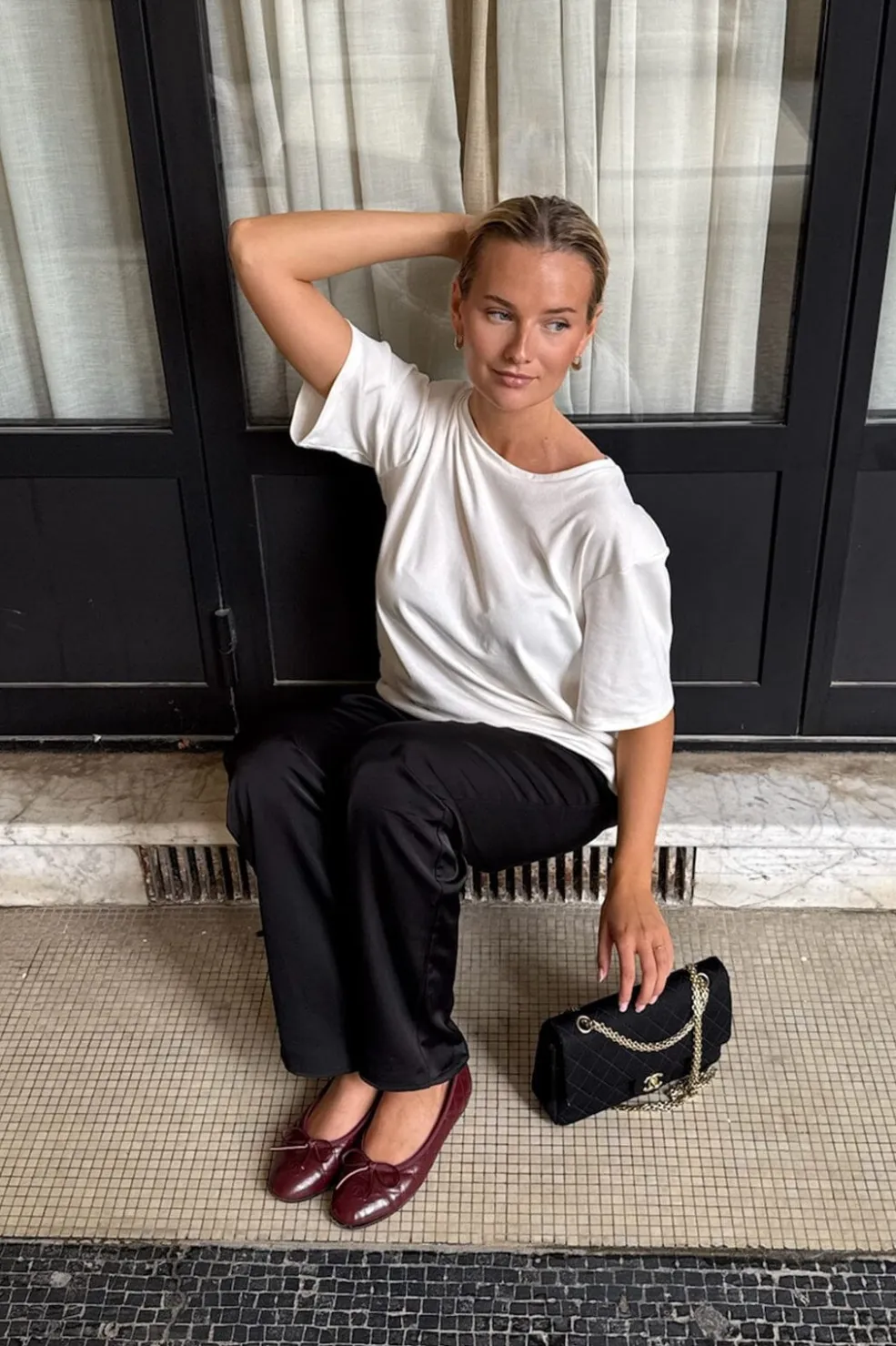Sorte satinbukser fra BYIC med en skinnende overflade. Bukserne har en løs pasform og snøre i taljen, hvilket gør dem behagelige at have på.