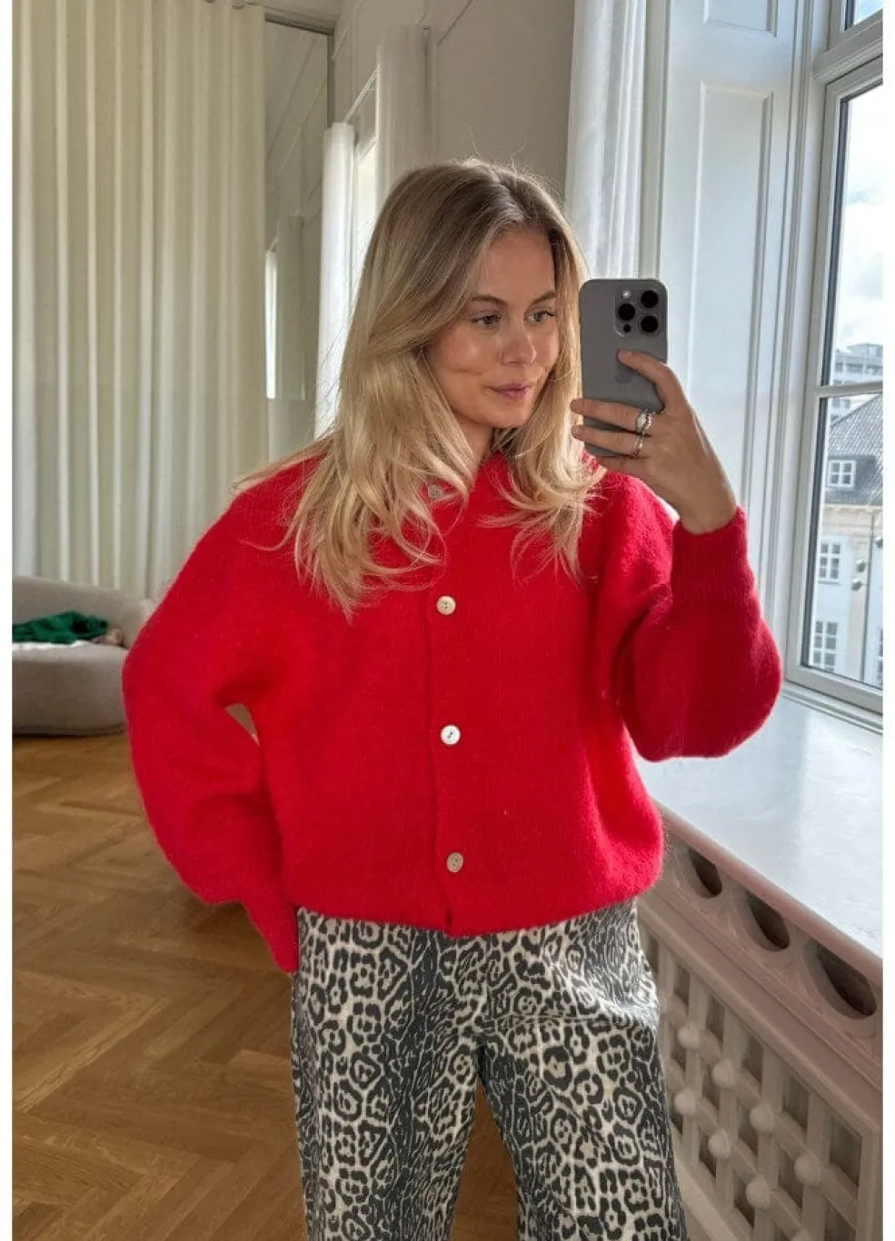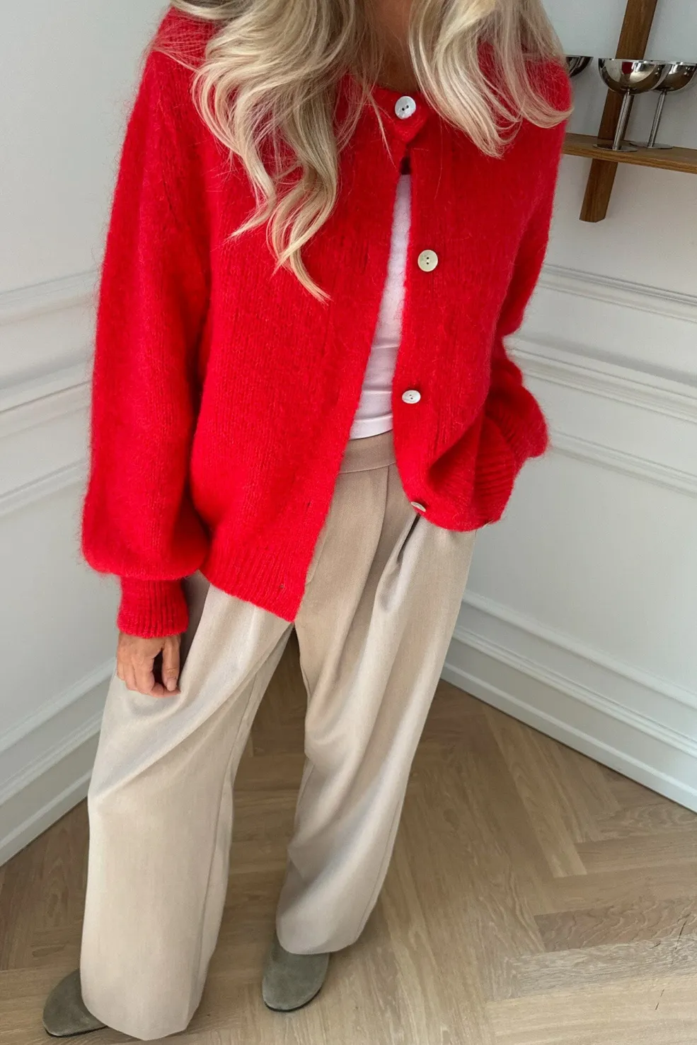 Fuzzy mohair cardigan med lange voluminøse ærmer, rib detaljer og perlemorslook på knapperne. Passer til størrelsen.