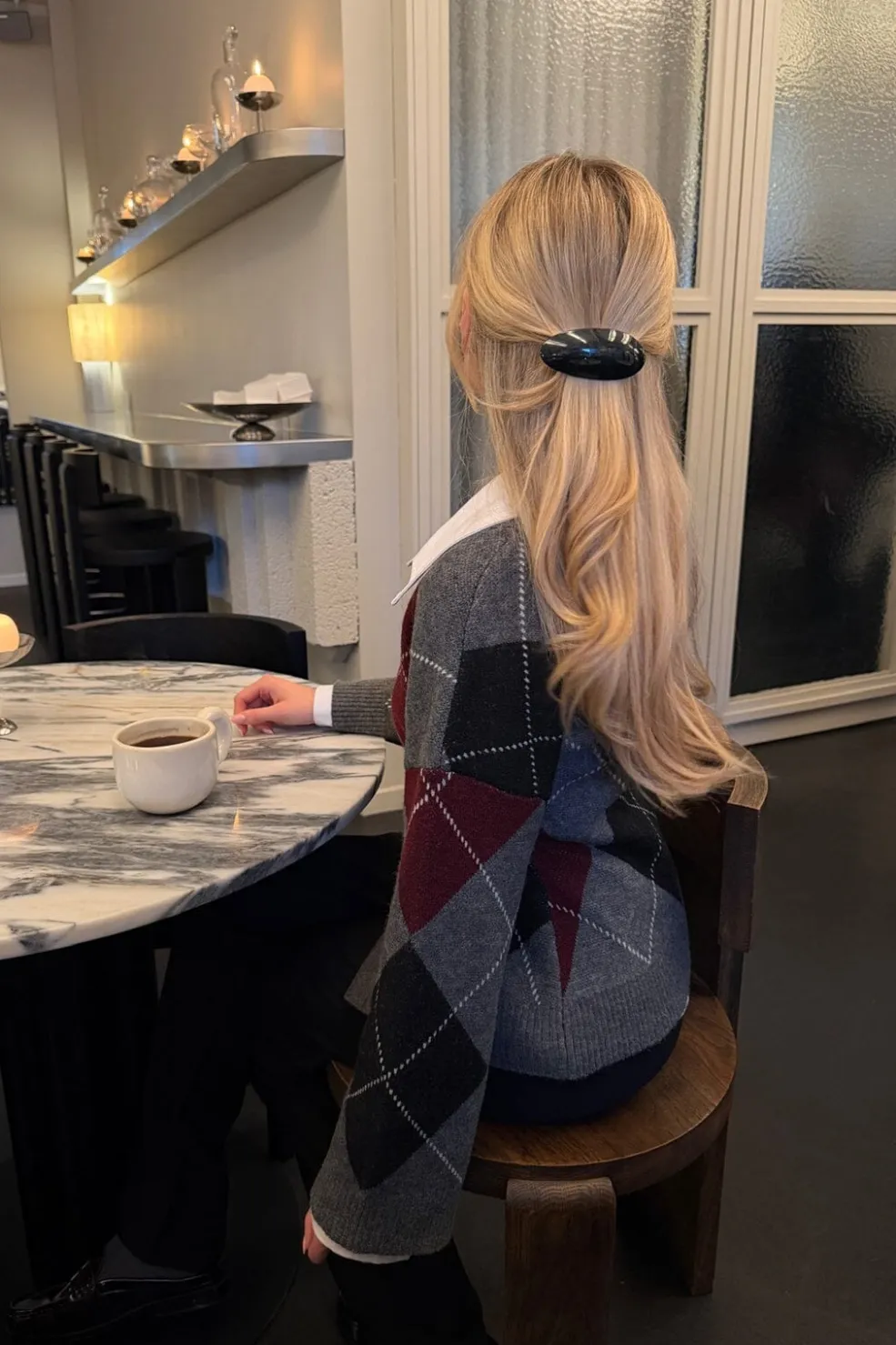 En ternet cardigan fra BYIC med et argyle-mønster i grå, rød og bordeaux. Cardiganen har en løs pasform og knaplukning.