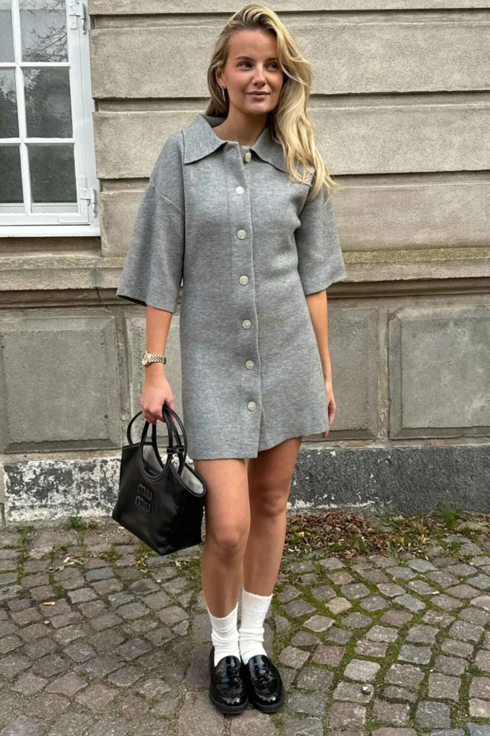 Grå strikkjole fra BYIC med knapper foran og skjortekrave. Kjolen har korte ærmer og går til låret. Den er strikket i en blød kvalitet med store knapper.