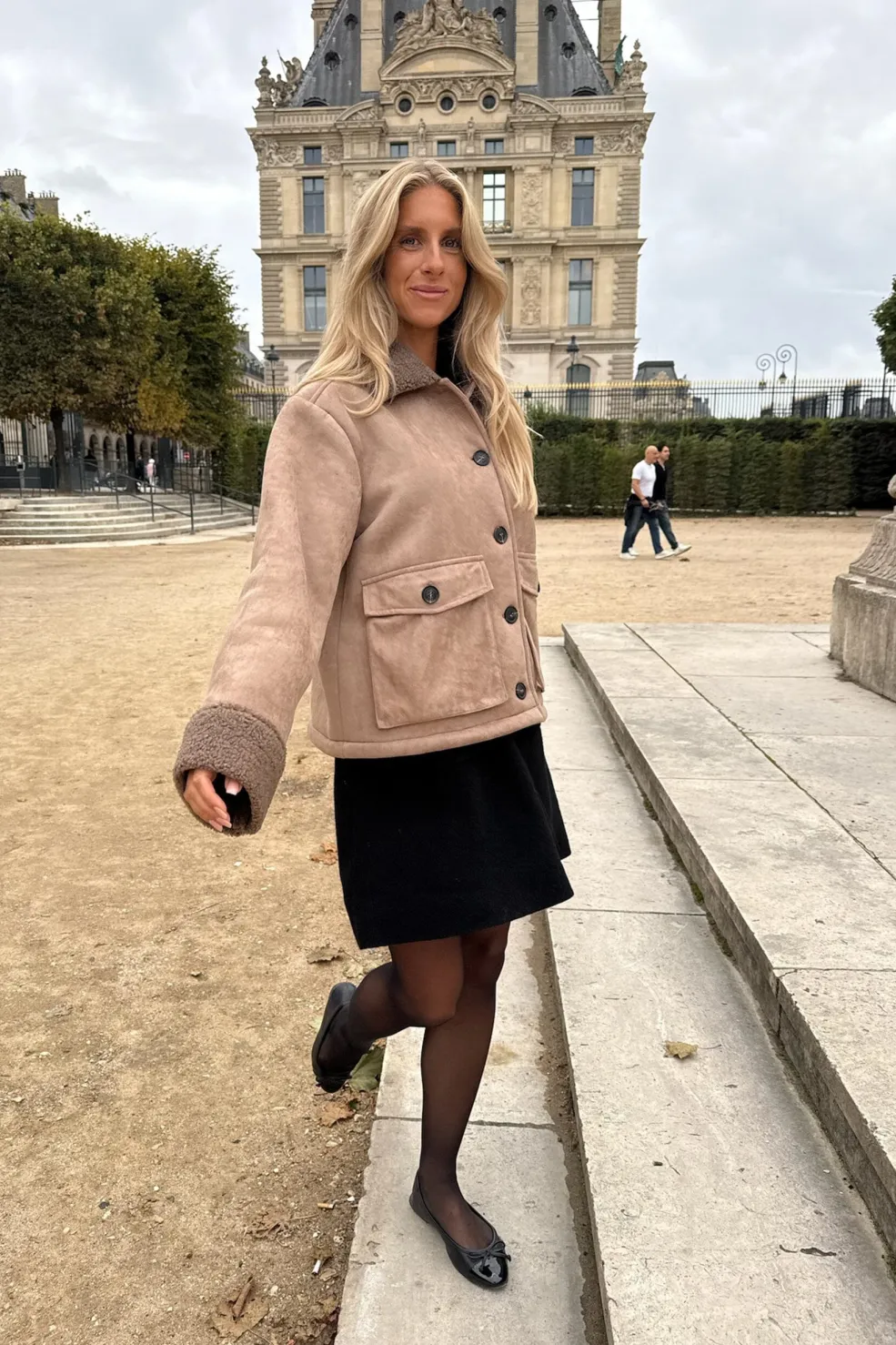 Lysebrun teddyjakke fra BYIC med skjortekrave og kontrasterende detaljer. Jakken har en regular fit og store lommer foran. Knapper hele vejen ned gør den nem at tage af og på.