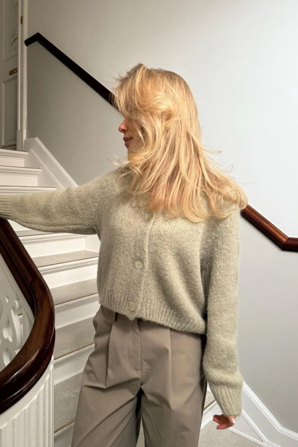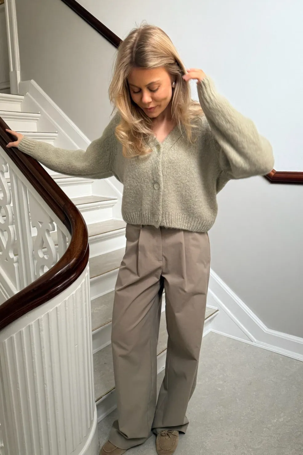 Pistaciegrøn cardigan fra BYIC med V-hals og knapper foran. Den løse pasform og de ribbede kanter giver et afslappet look.