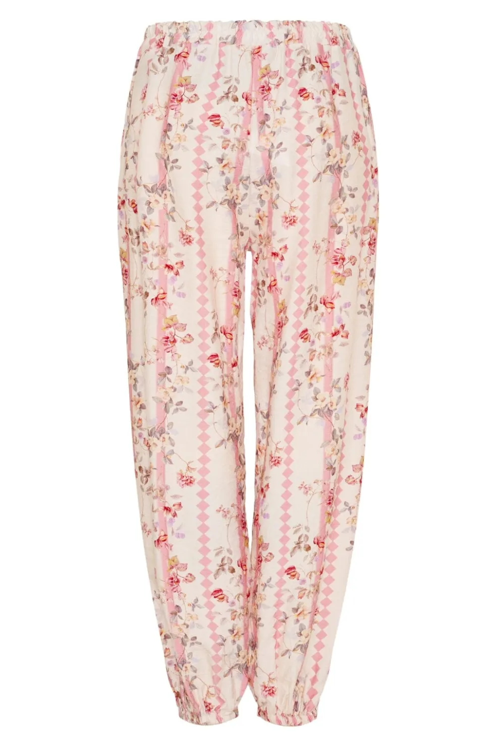 Bukser fra Marta Du Chateau i hvid med blomstermønster i pink og creme nuancer. De har en klassisk pasform og ankellængde med elastiske detaljer.