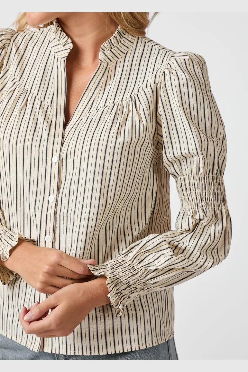 Stribet bluse fra Neo Noir i creme med mørke striber. Blusen har v-hals, lange ærmer med rynkedetaljer og knapper foran. Stoffet er en blanding af polyester og bomuld.