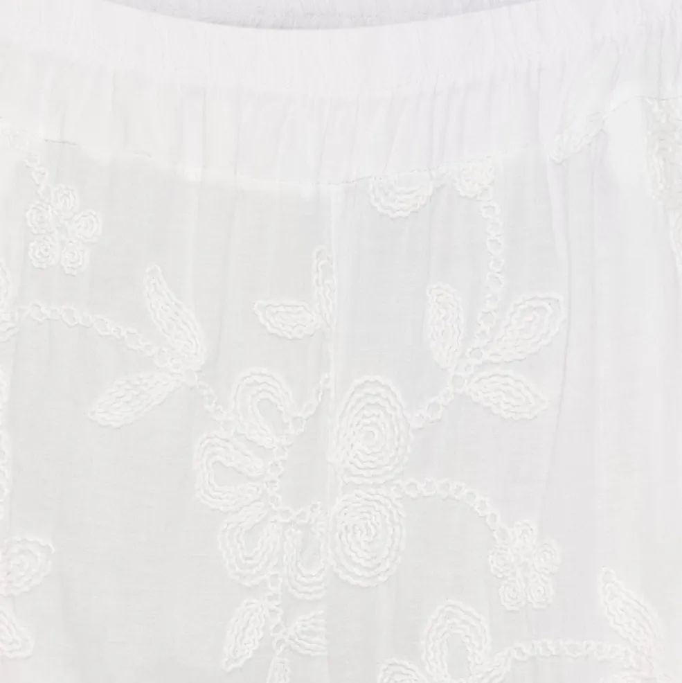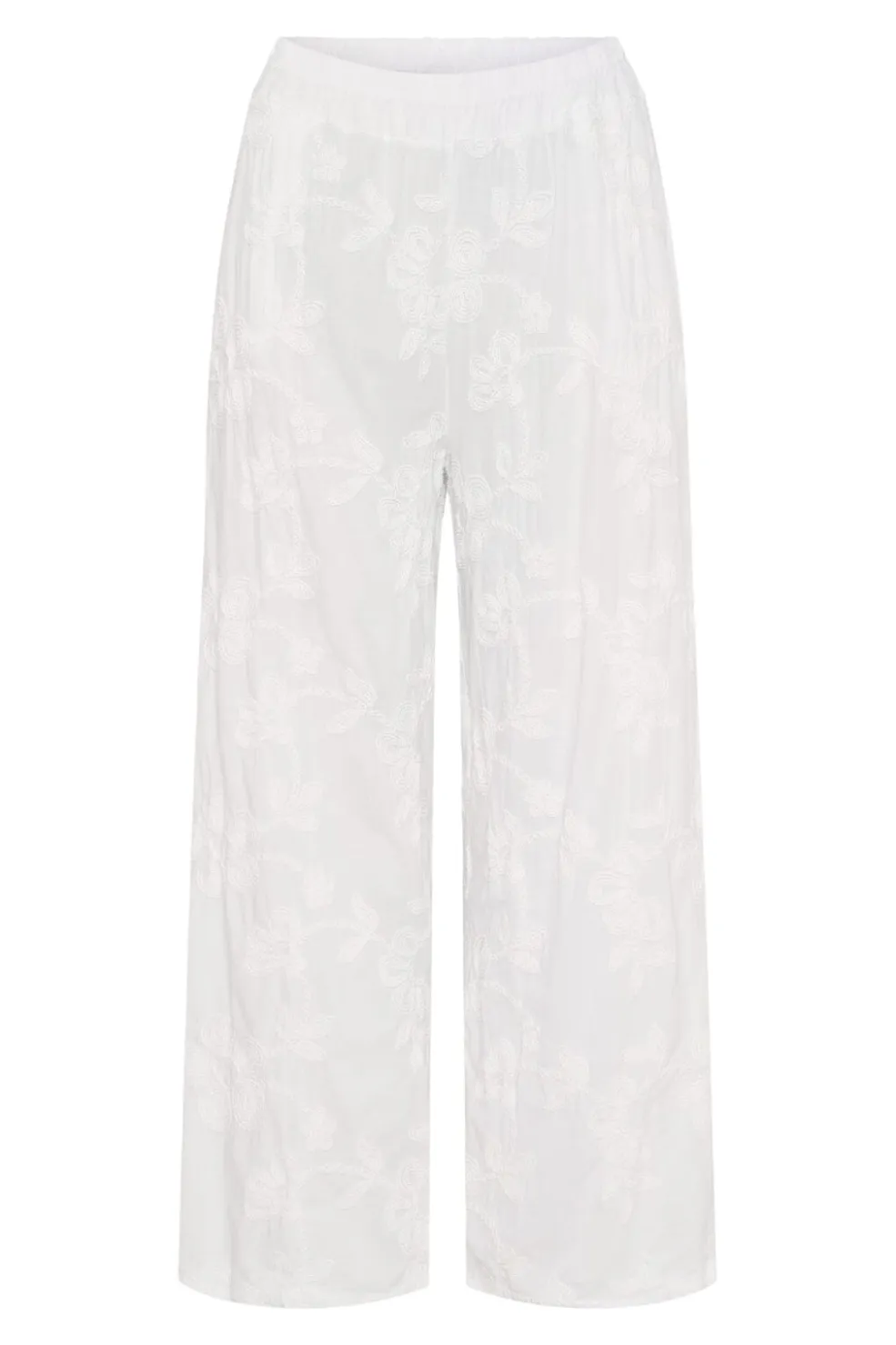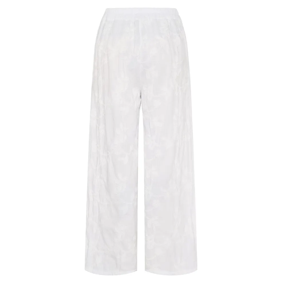 Hvide bukser fra Marta Du Chateau med blomsterbroderi over hele stoffet. Bukserne har brede ben og en elastisk talje, der giver god bevægelsesfrihed.