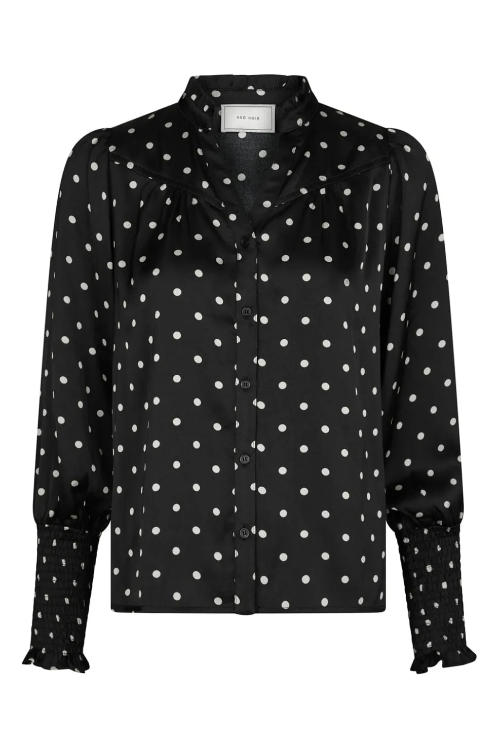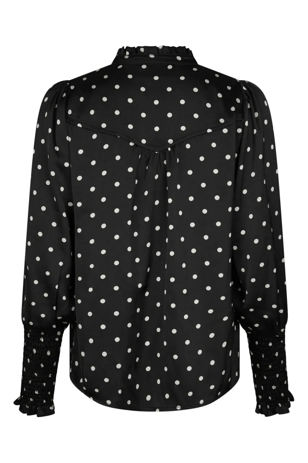 Sort bluse fra Neo Noir med hvide prikker. Blusen har V-hals, knaplukning foran og flæsedetaljer ved kraven.