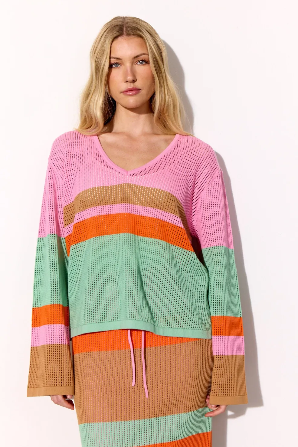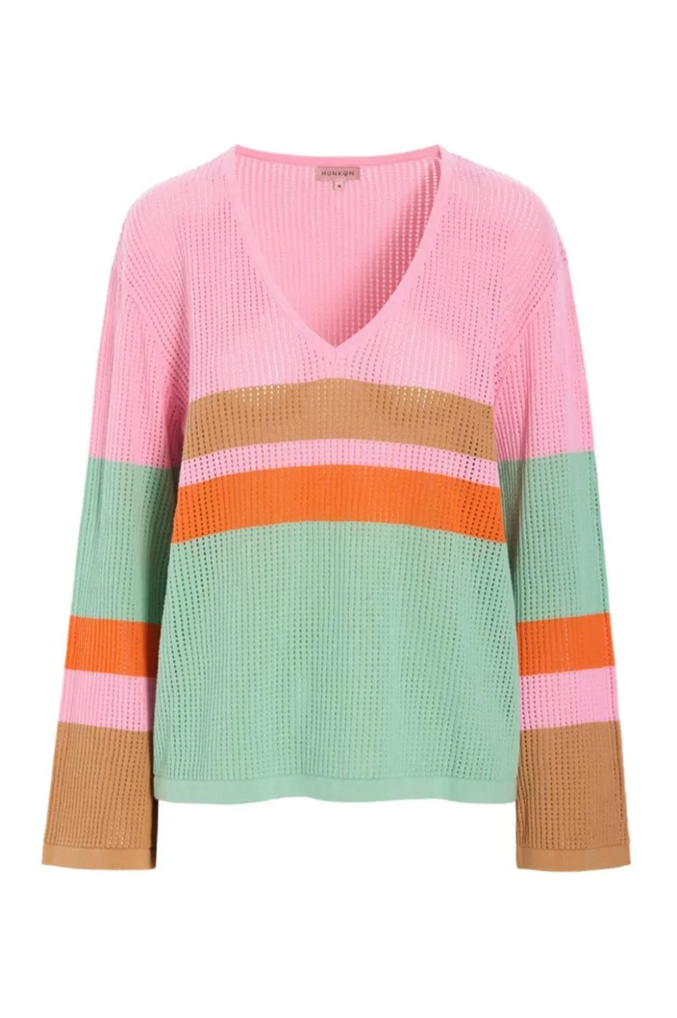 Bluse fra Hunkøn med striber i pink, mintgrøn, orange og brun. Den har en mesh-strikket struktur og en løs pasform.