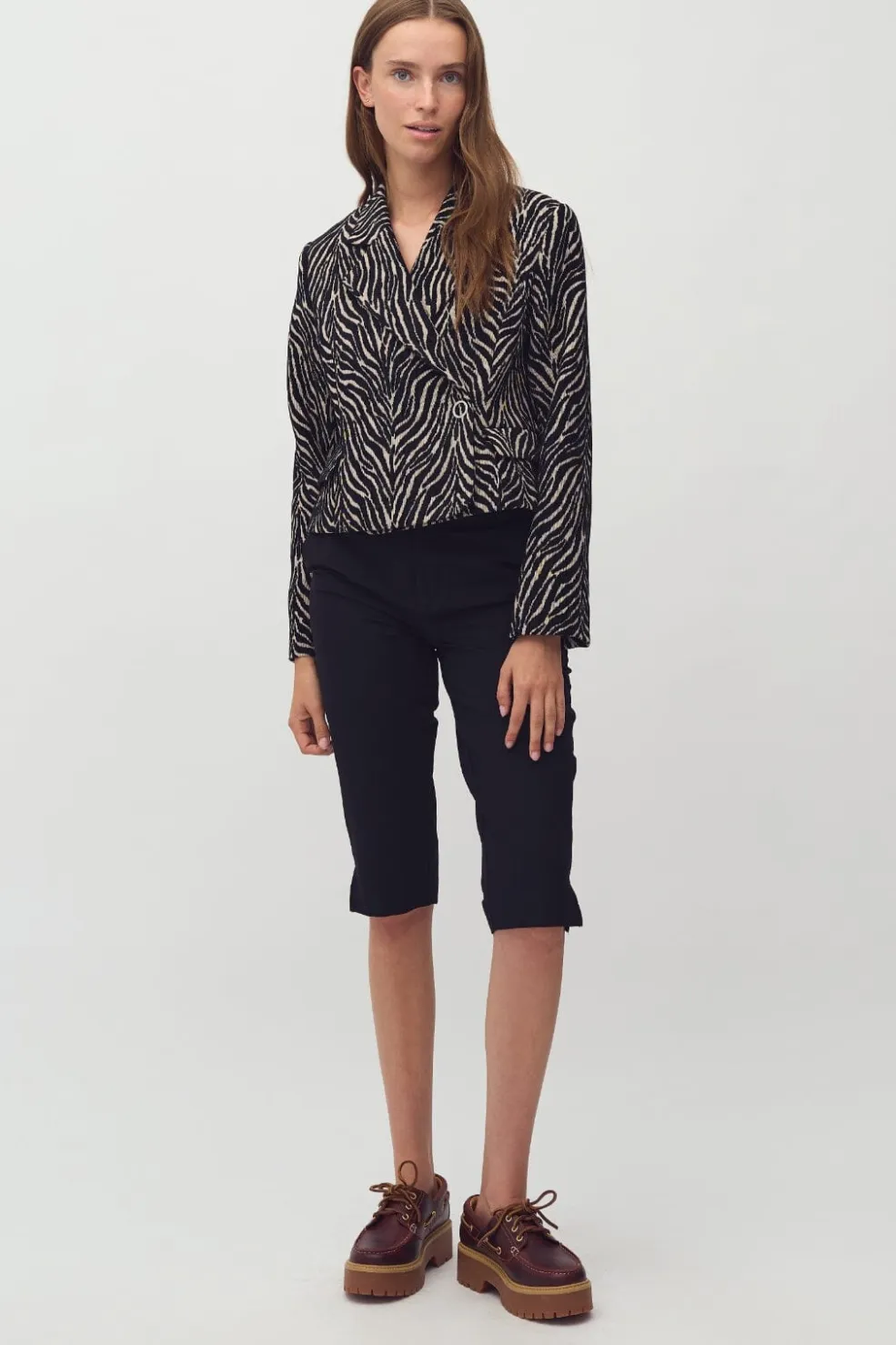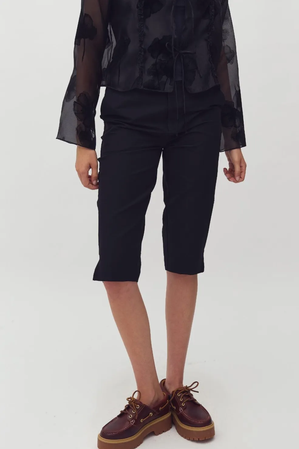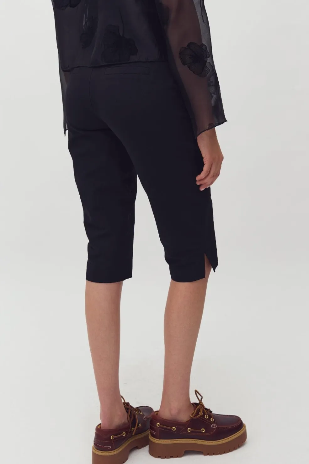 Sorte capribukser fra MbyM i kalvelængde med en normal pasform. Bukserne har et enkelt design med elastisk lukning og er fremstillet i en blød materialekombination.