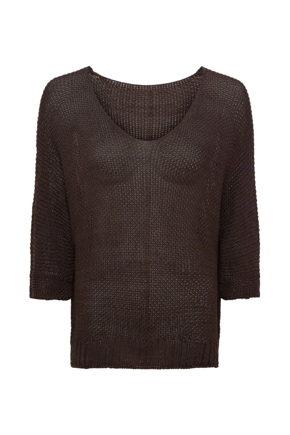 Brun striktrøje fra Marta Du Chateau med V-udskæring og løs strikstruktur. Trøjen har 3/4 ærmer og en afslappet pasform med ribkant forneden.