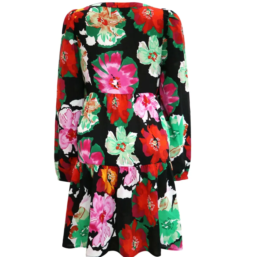 Sort kjole med store blomster i rød, pink og grøn. Det lagdelte design giver kjolen en flydende silhuet, mens den firkantede halsudskæring og de lange ærmer skaber et rent udtryk.