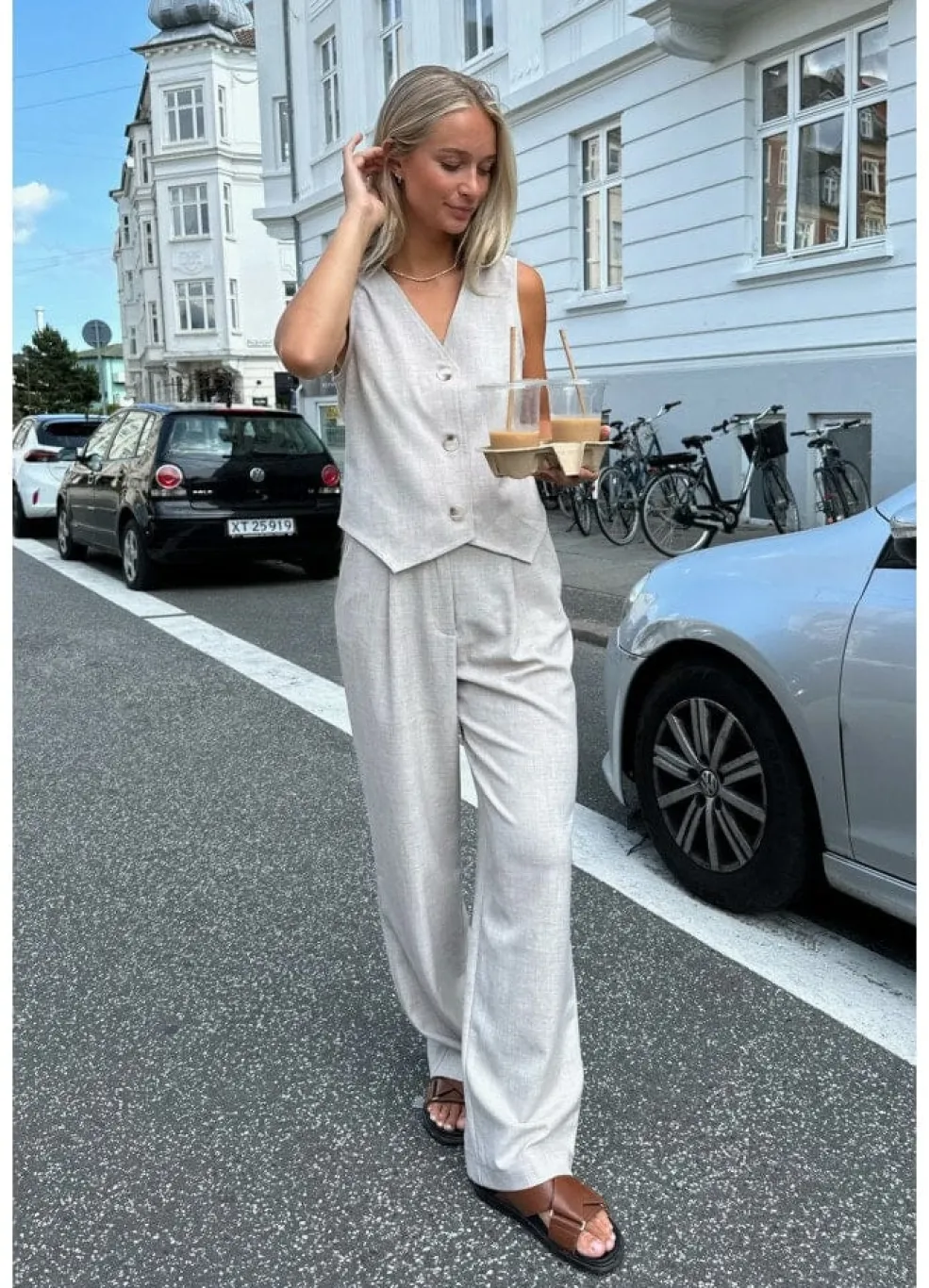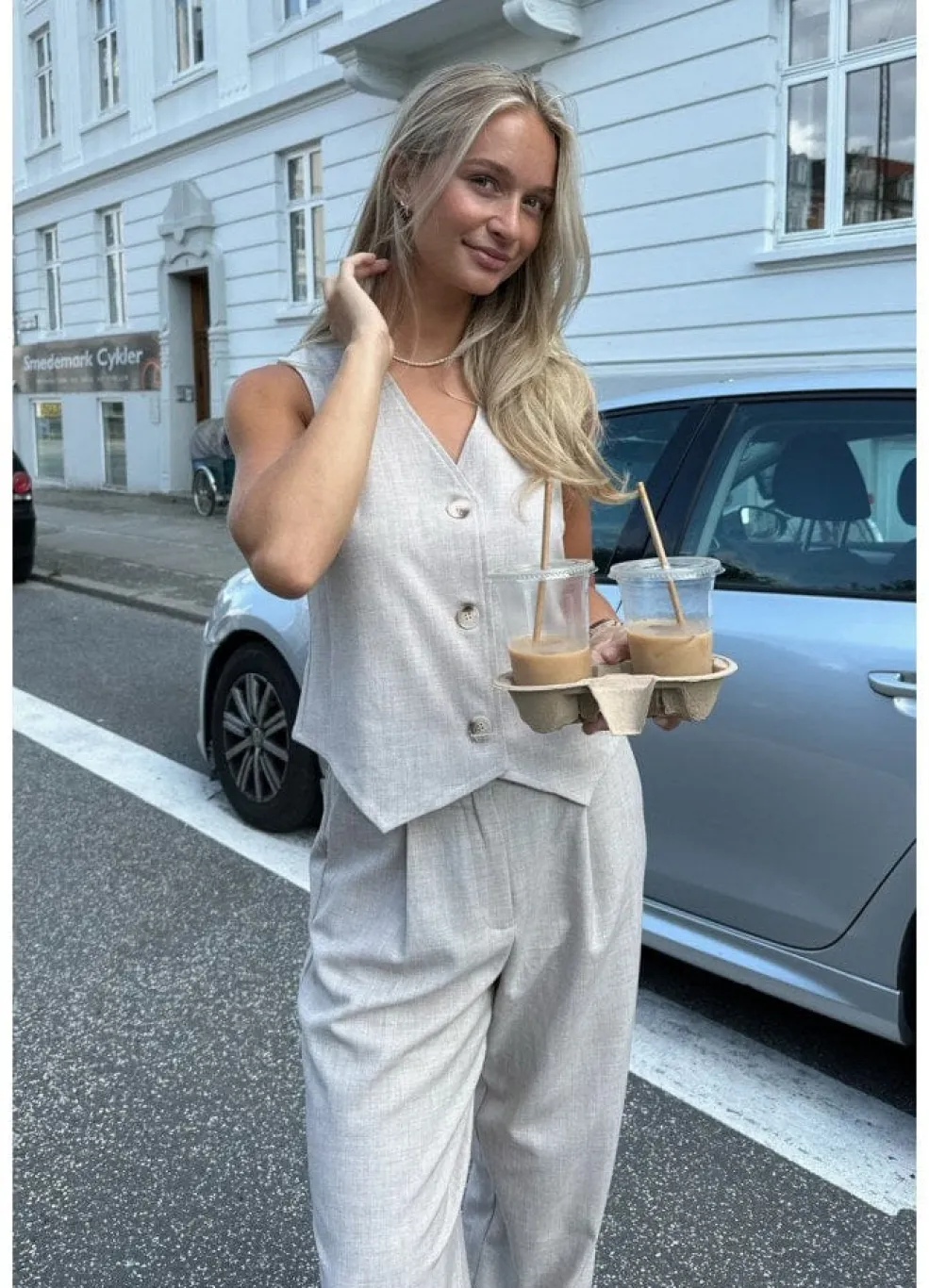 Beige vest fra BYIC med tre knapper foran og V-halsudskæring. Den ærmeløse model matcher Celina-bukserne og har en regular fit-pasform.