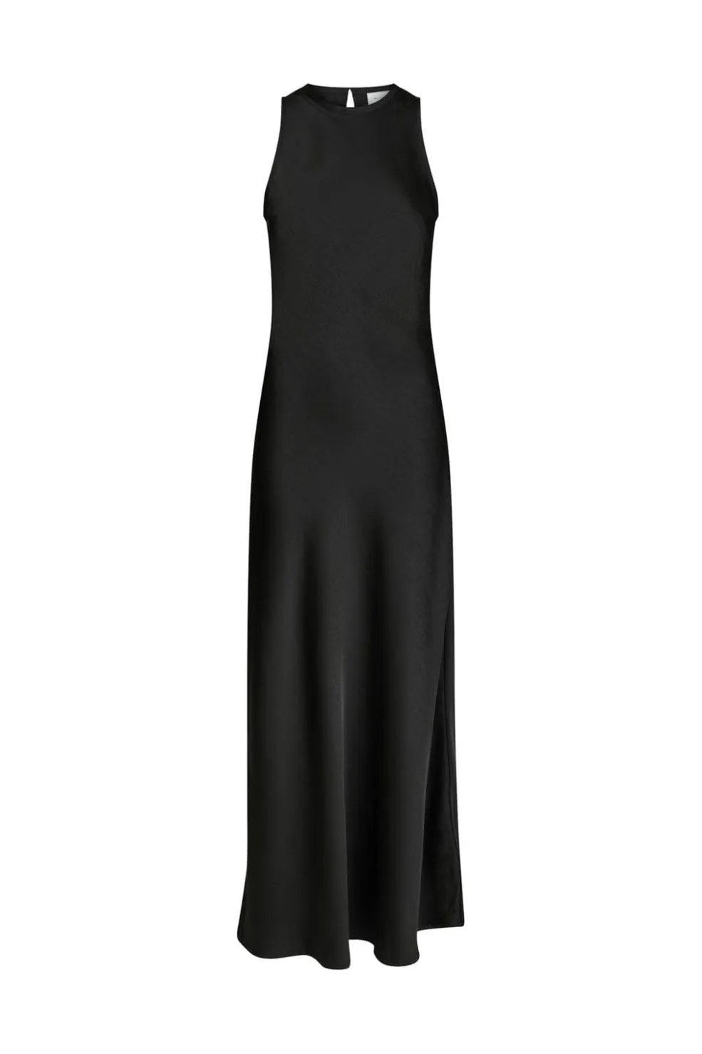 Sort lang kjole i kraftig satin fra Neo Noir. Den ærmeløse kjole har en rund halsudskæring og et nøglehul i ryggen. Kjolen er velegnet til bryllupper og andre formelle begivenheder.