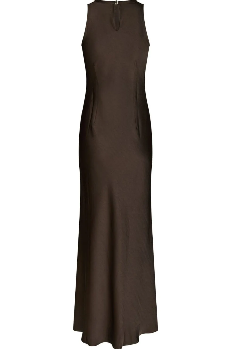 Lang kjole fra Neo Noir i mørkebrun satin. Den har høj hals, ærmeløst design og en nøglehul-detalje i ryggen.