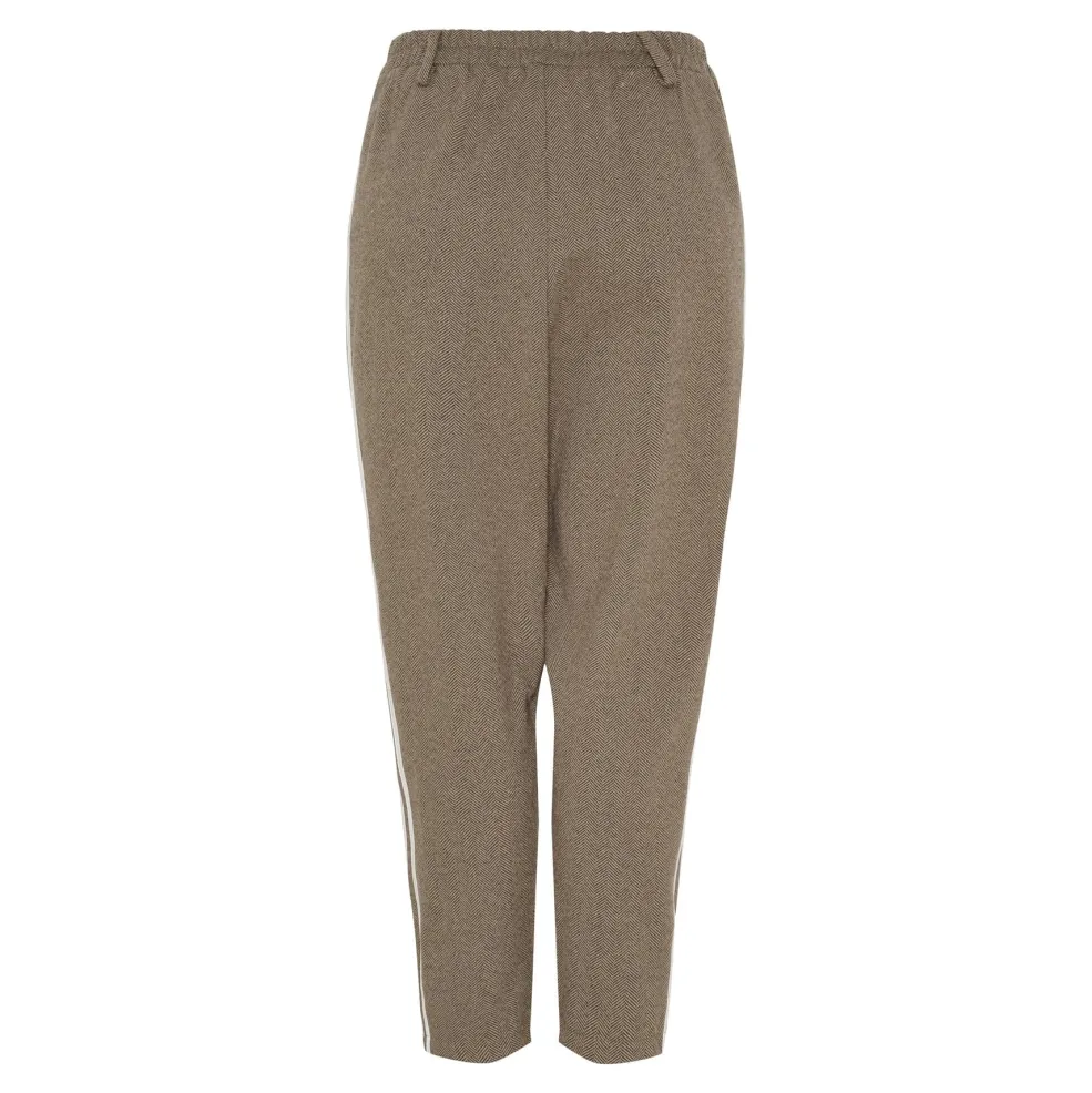Brune bukser fra Marta Du Chateau med hvide striber langs benene. Bukserne har en løs pasform og går til midt på læggen. De har både lynlås, elastik og knapper i taljen.
