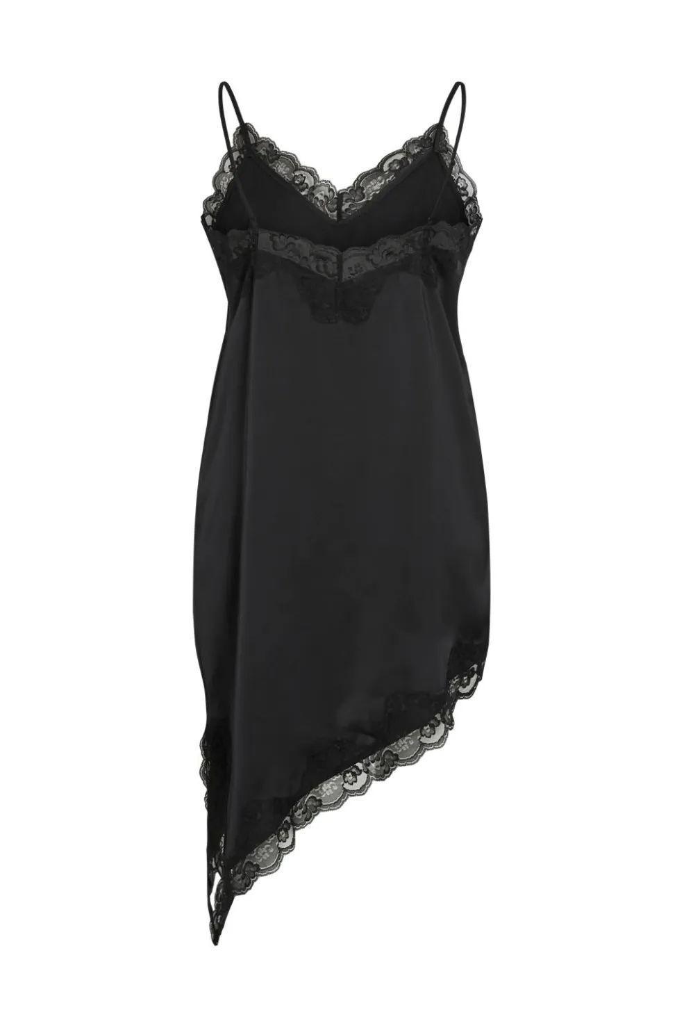 Sort kjole fra Vila med tynde stropper og blondekant. Kjolen har V-udskæring og asymmetrisk kant, der giver den et unikt snit. Den er fremstillet af genanvendt polyester.