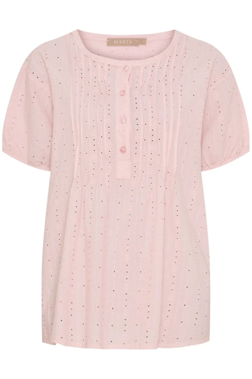 Lyserød bluse fra Marta Du Chateau med struktureret blomstermønster og broderi. Blusen har korte pufærmer, rund halsudskæring og knaplukning foran med tre knapper.
