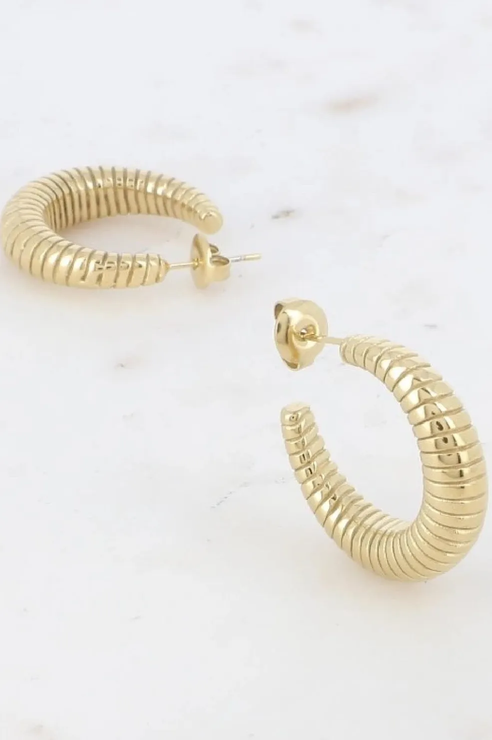 Runde hoops fra Mellow Moon med en bølget, ribbet overflade. Øreringene er lavet i rustfrit stål med en gylden finish, der skaber et fint spil i lyset.