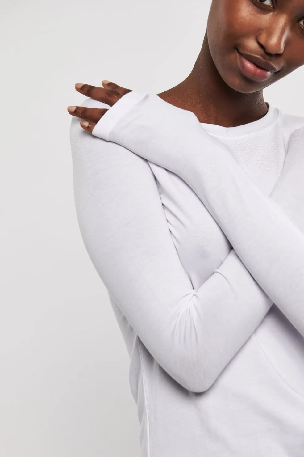 Hvid bluse fra MbyM i blødt TENCEL™ Modal med lange ærmer og rund hals. Den tætsiddende pasform og det strækbare materiale gør den velegnet til både sport og hverdag.
