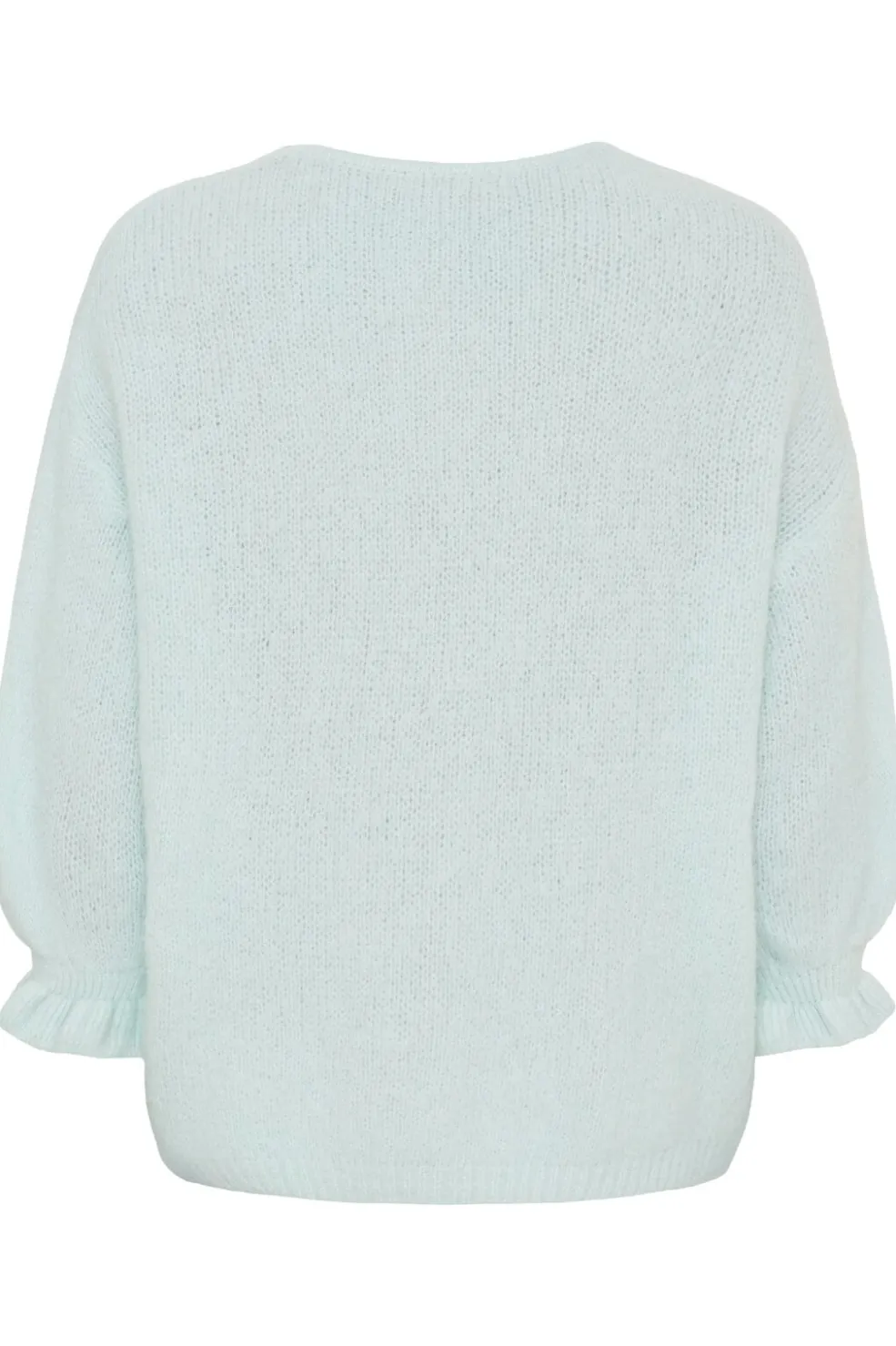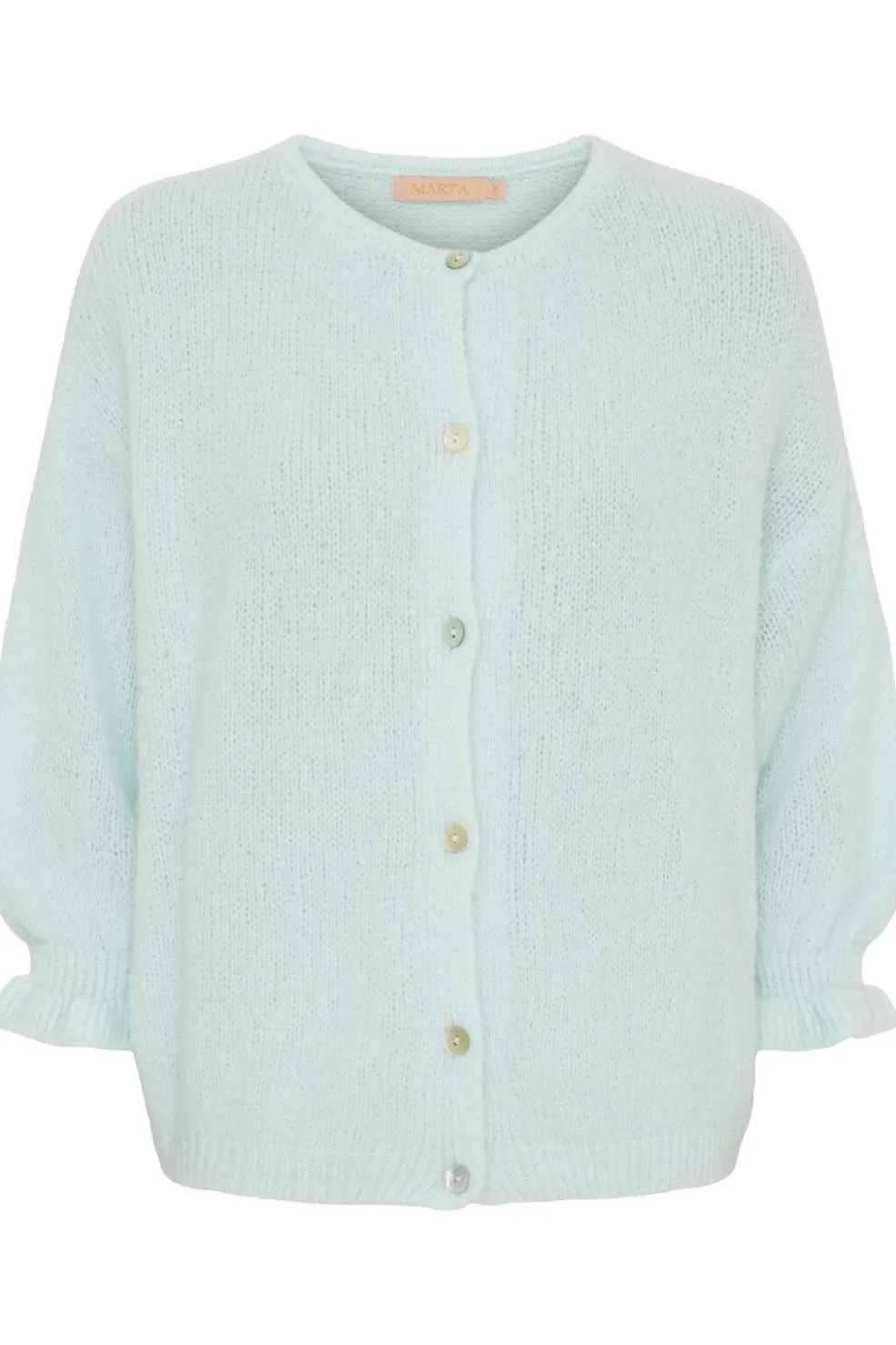 Himmelblå strikket cardigan fra Marta Du Chateau med rund halsudskæring og knaplukning. Cardiganen har puffede trekvartærmer og en normal pasform.