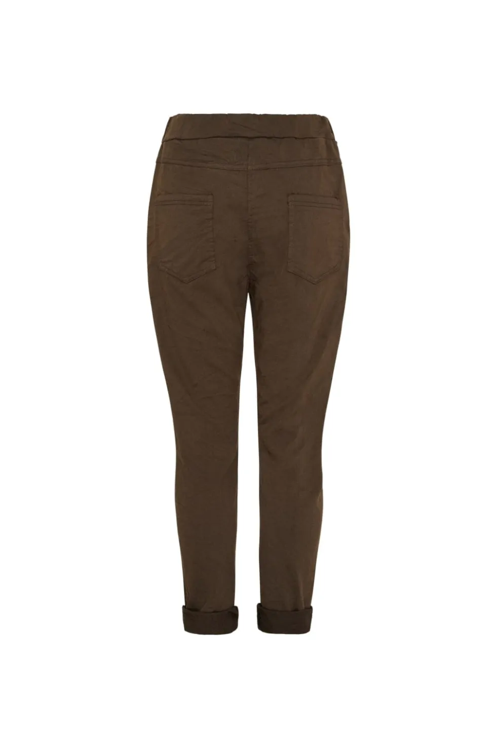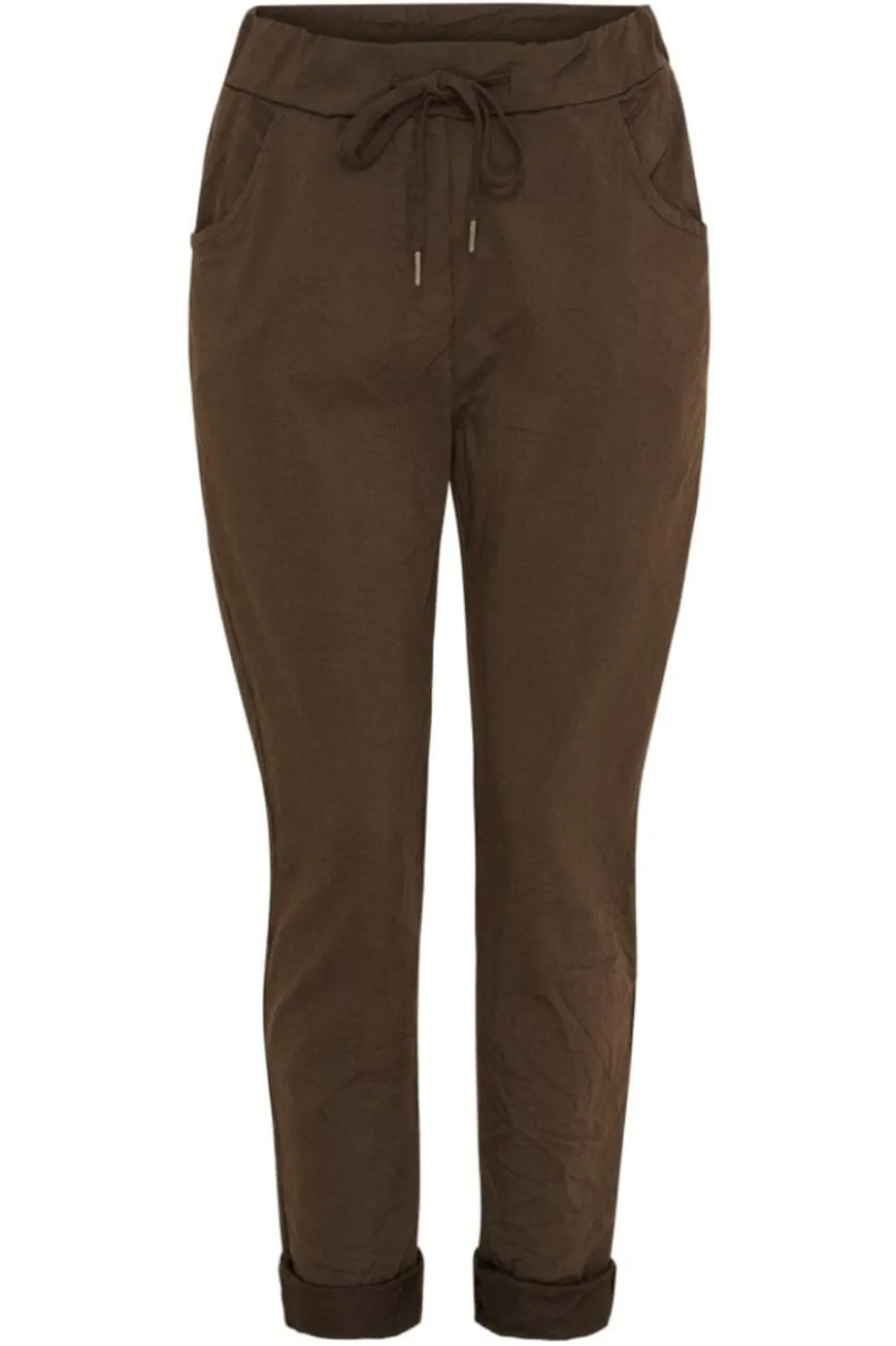 Brune bukser fra Marta Du Chateau i ankellængde. Bukserne har en almindelig taljehøjde med snøre og elastik i taljen, hvilket giver en god tilpasning.