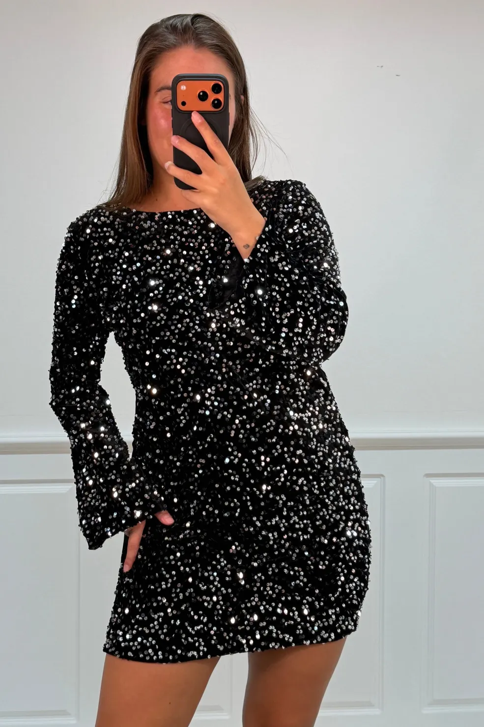 Festkjole fra A-bee med glitrende pailletter og sløjfedetaljer. Kjolen har en sort base med sølvfarvet mønster og lange ærmer. Den runde halsudskæring og sløjfen på ryggen giver kjolen et festligt præg.