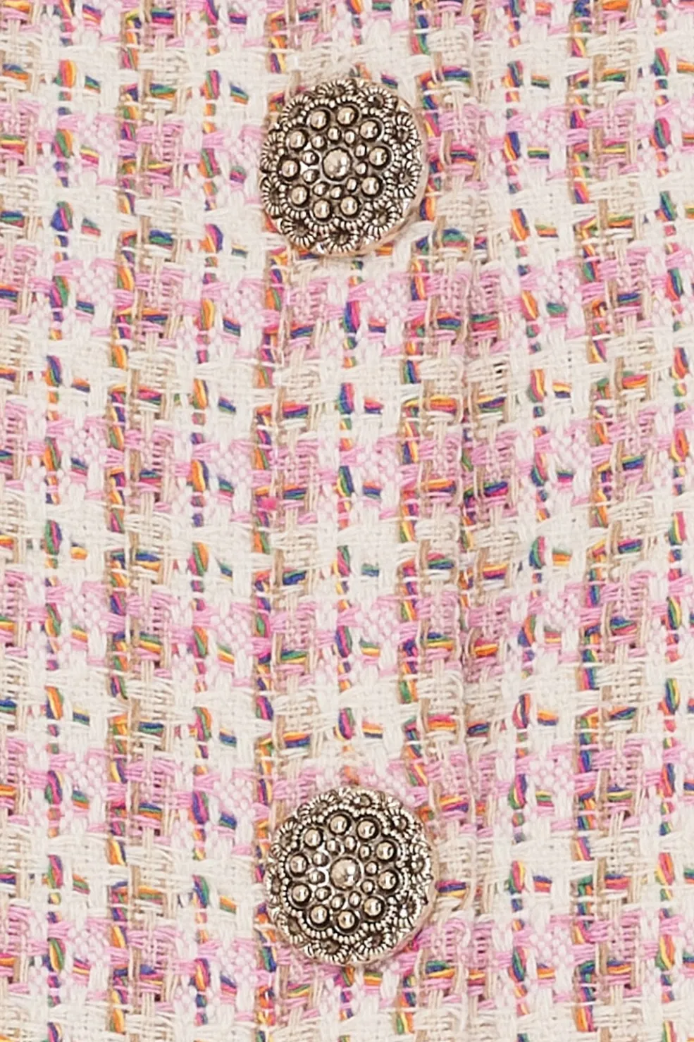 Vest fra Marta Du Chateau i rosa med et småmønstret design i creme- og hvide nuancer. Den har korte ærmer og en rund halsudskæring med dekorative metalknapper foran.