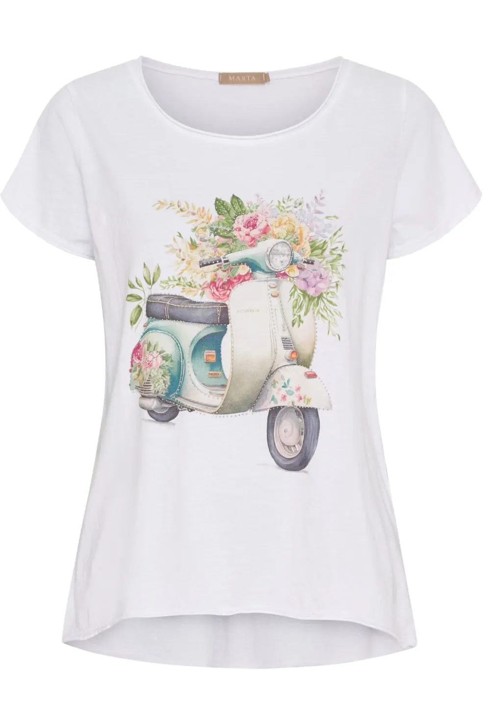 Hvid t-shirt fra Marta Du Chateau med et blomsterdekoreret Vespa-print. T-shirten har en rund halsudskæring og korte ærmer.