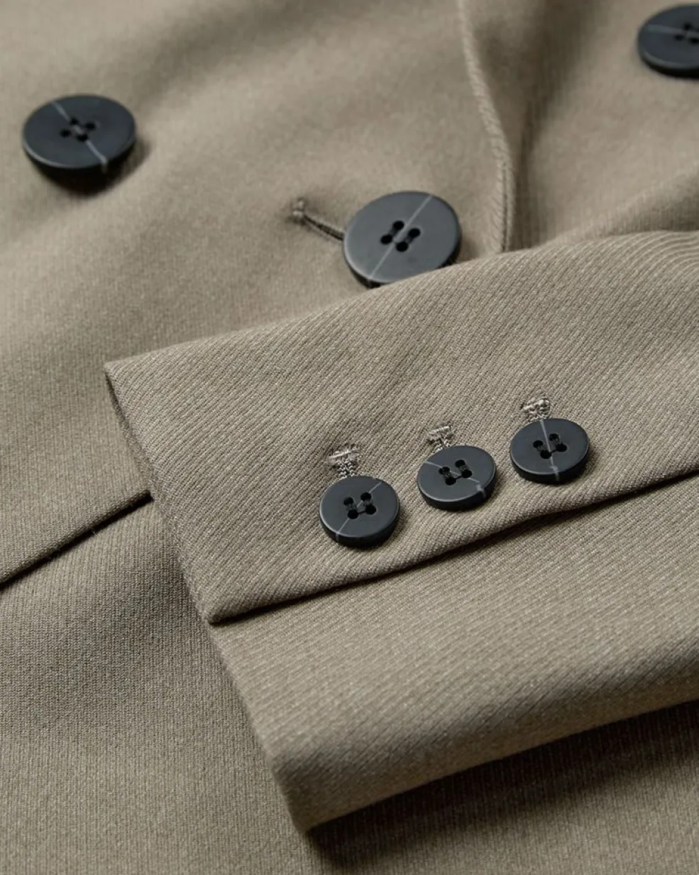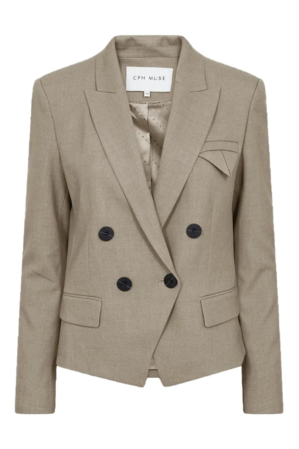 Blazer fra Copenhagen Muse i en beige og grøn melange-farve. Blazeren har et klassisk tuxedo-look med V-udskæring og revers samt dekorative syninger.
