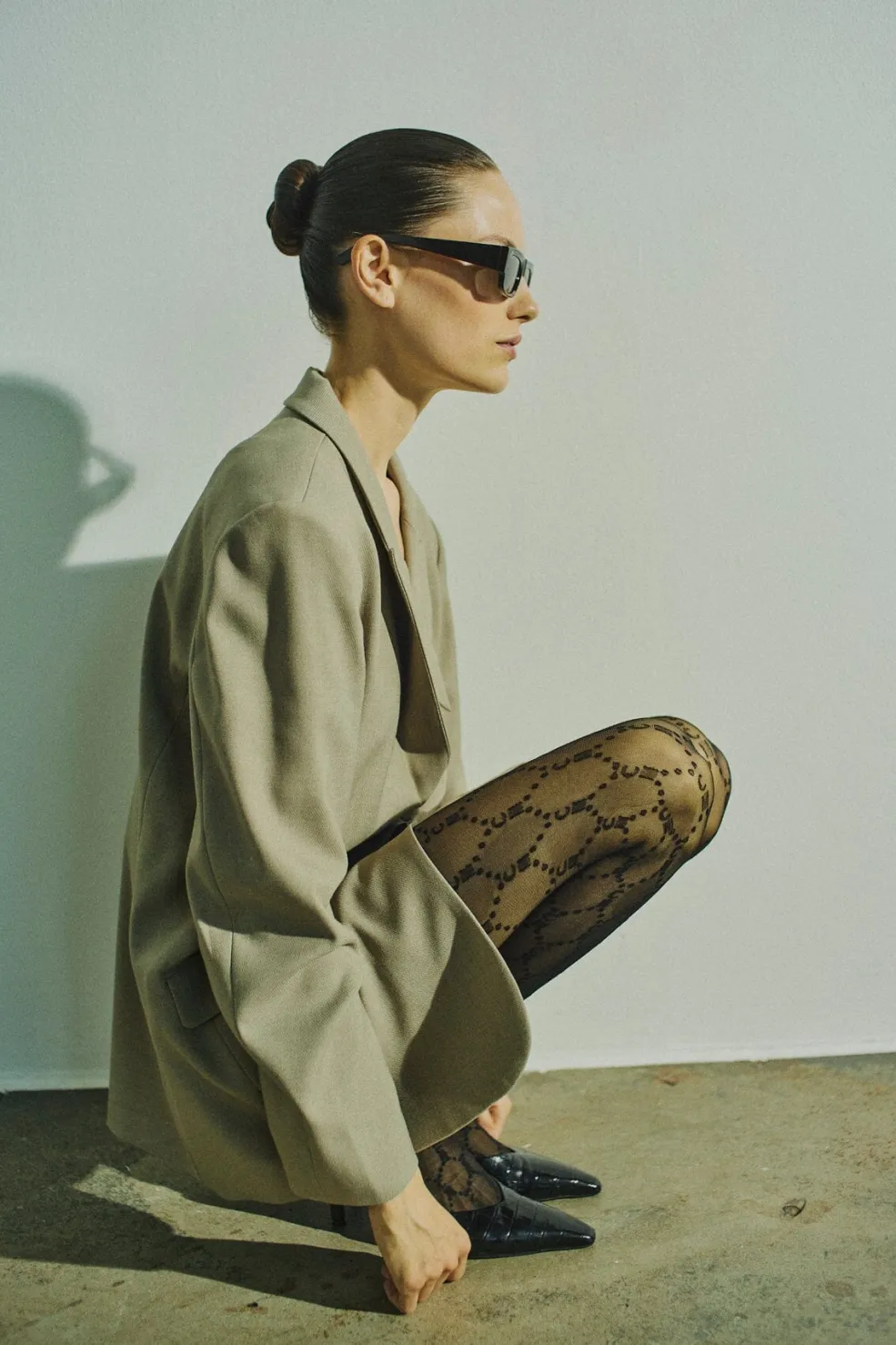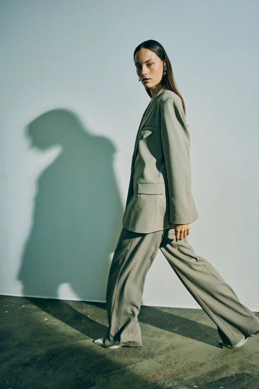 Skræddersyet blazer fra Copenhagen Muse i en beige-grøn meleret farve. Jakken har brede skuldre, V-udskæring med revers og en logomønstret foering. Den passer til både formelle, afslappede og festlige lejligheder.