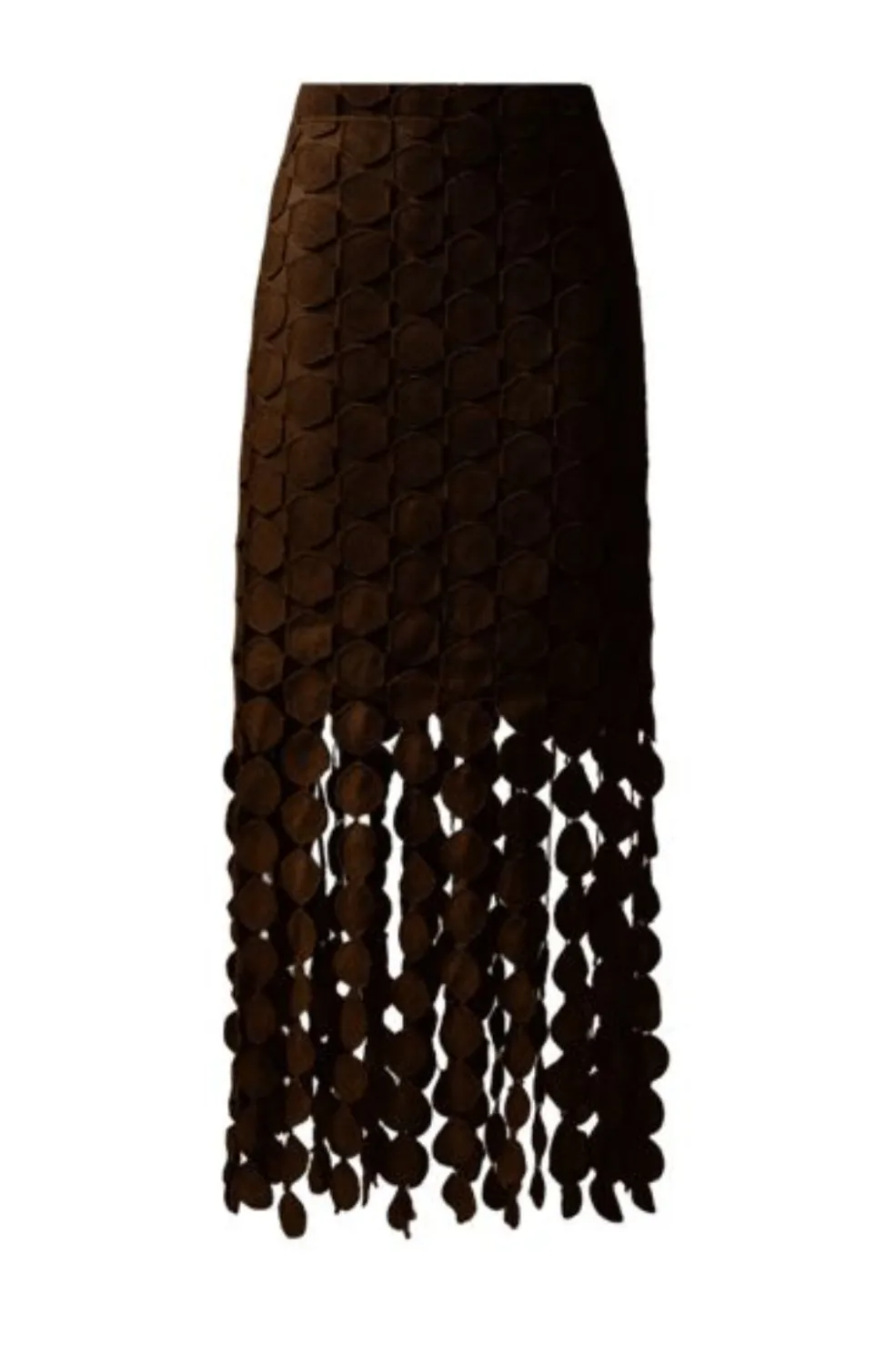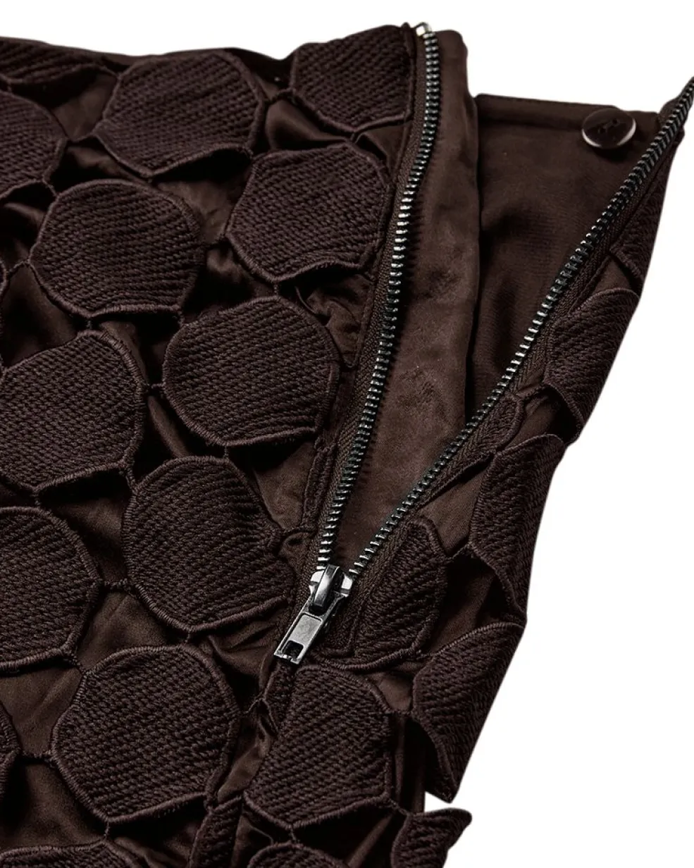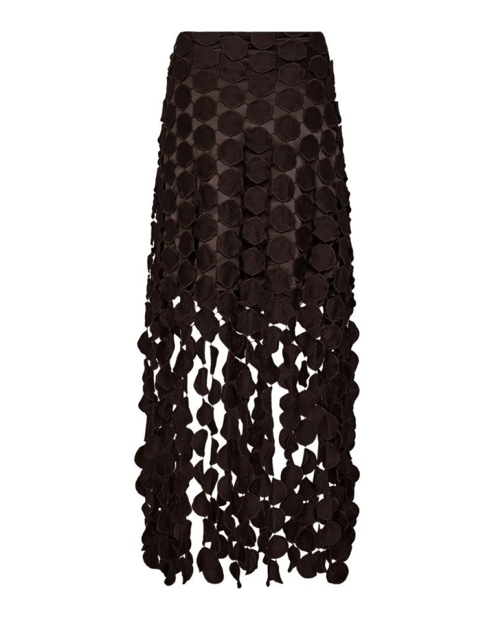 Knælang nederdel fra Copenhagen Muse, lavet af 100 % polyester i en brun nuance. Nederdelen har et cirkulært mønster i lag med løse cirkler i bunden.