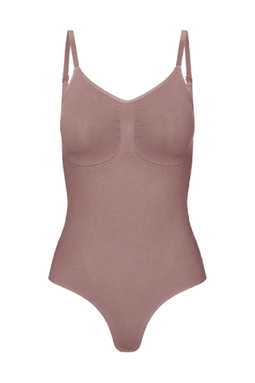 Shapewear bodysuit fra Lykkeland Ateliér i en beige-brun nuance. Bodysuiten har justerbare stropper og kompressionszoner på maven, ryggen og lårene.