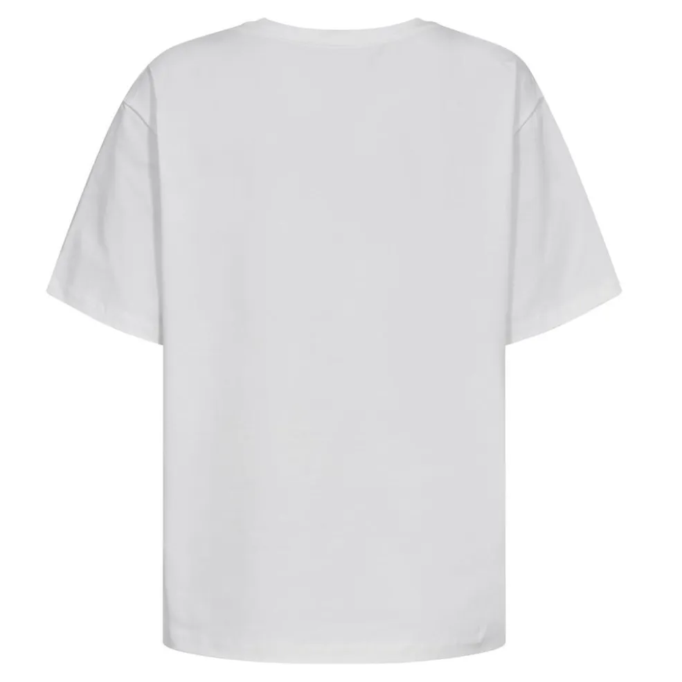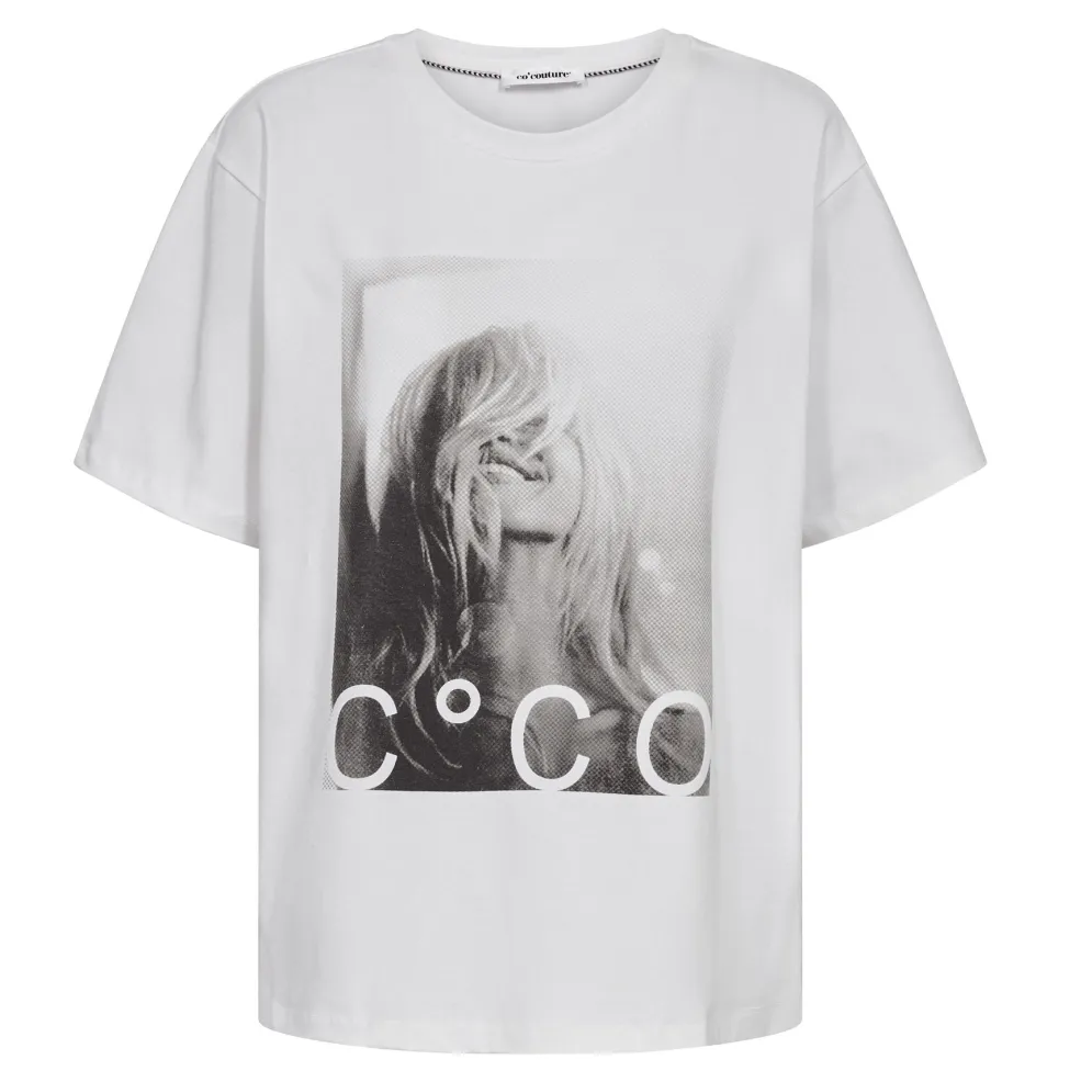 Hvid T-shirt fra Co´Couture med et sort-hvidt fotoprint på forsiden. Den har en klassisk rund halsudskæring og korte ærmer.