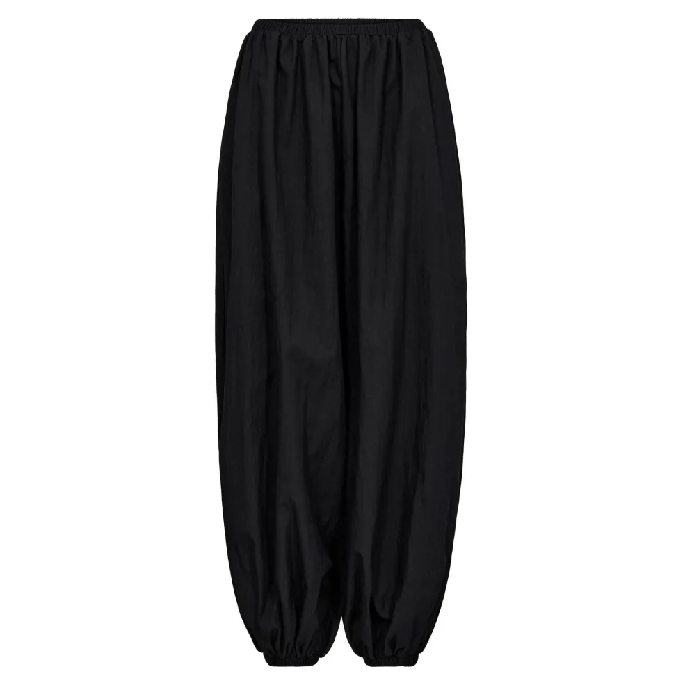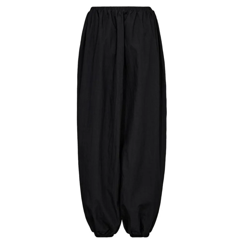 Sorte ballonbukser fra Co’Couture. Bukserne er lavet af 65% bomuld og 35% polyamid. Den sorte farve giver et neutralt udtryk.