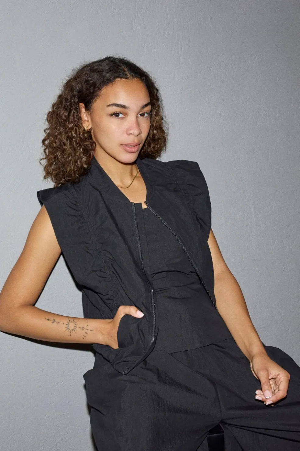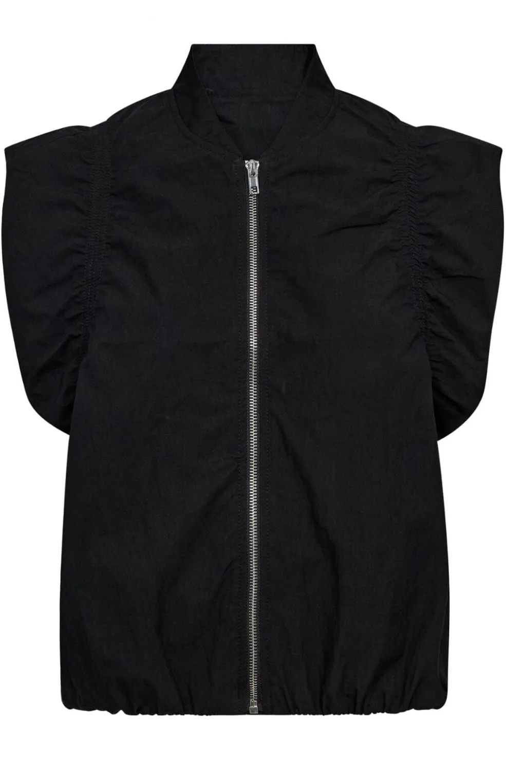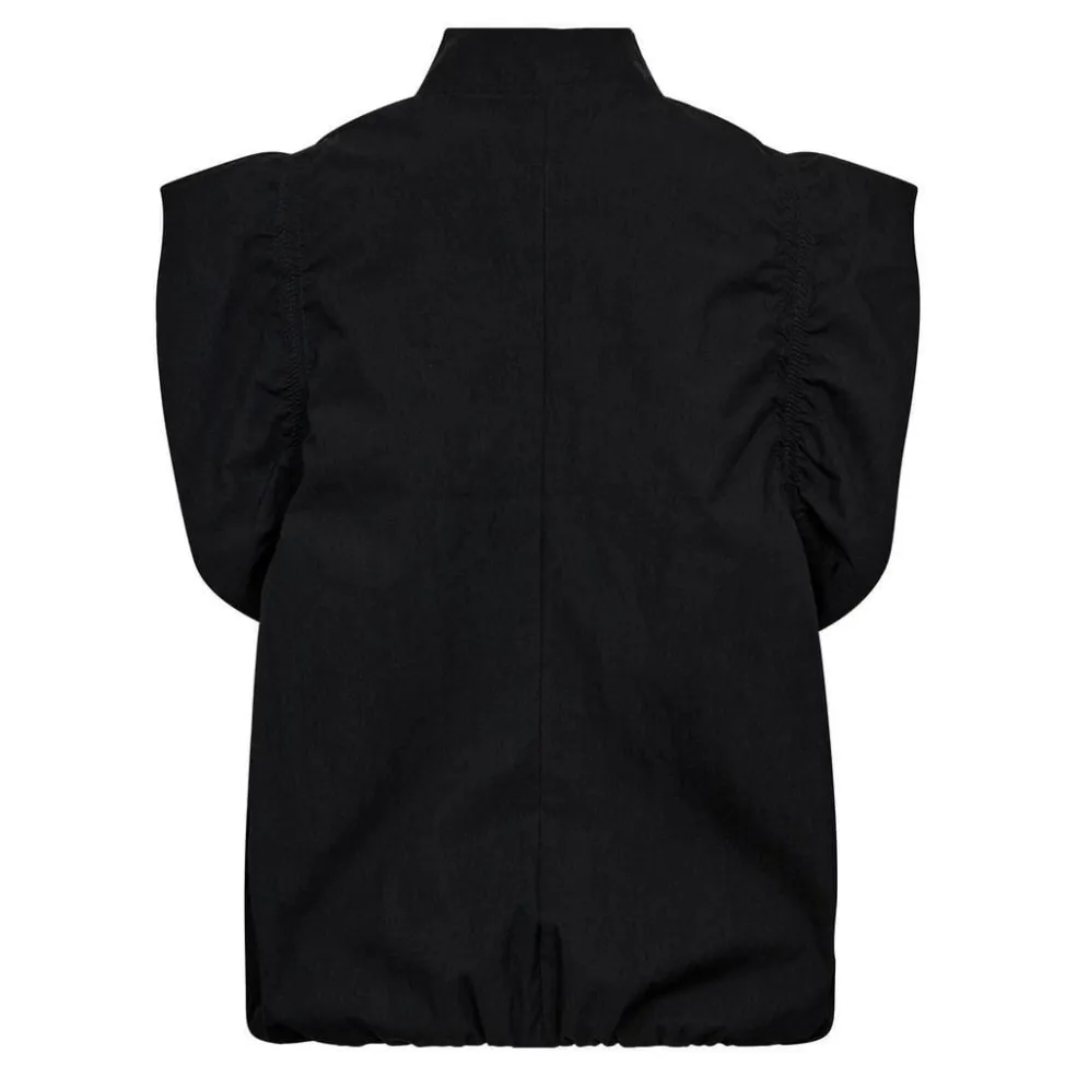 Sort vest fra Co´Couture med lynlås foran og høj krave. Vesten har rynker ved skuldrene og en løs pasform.