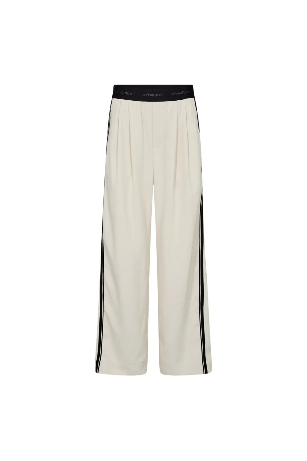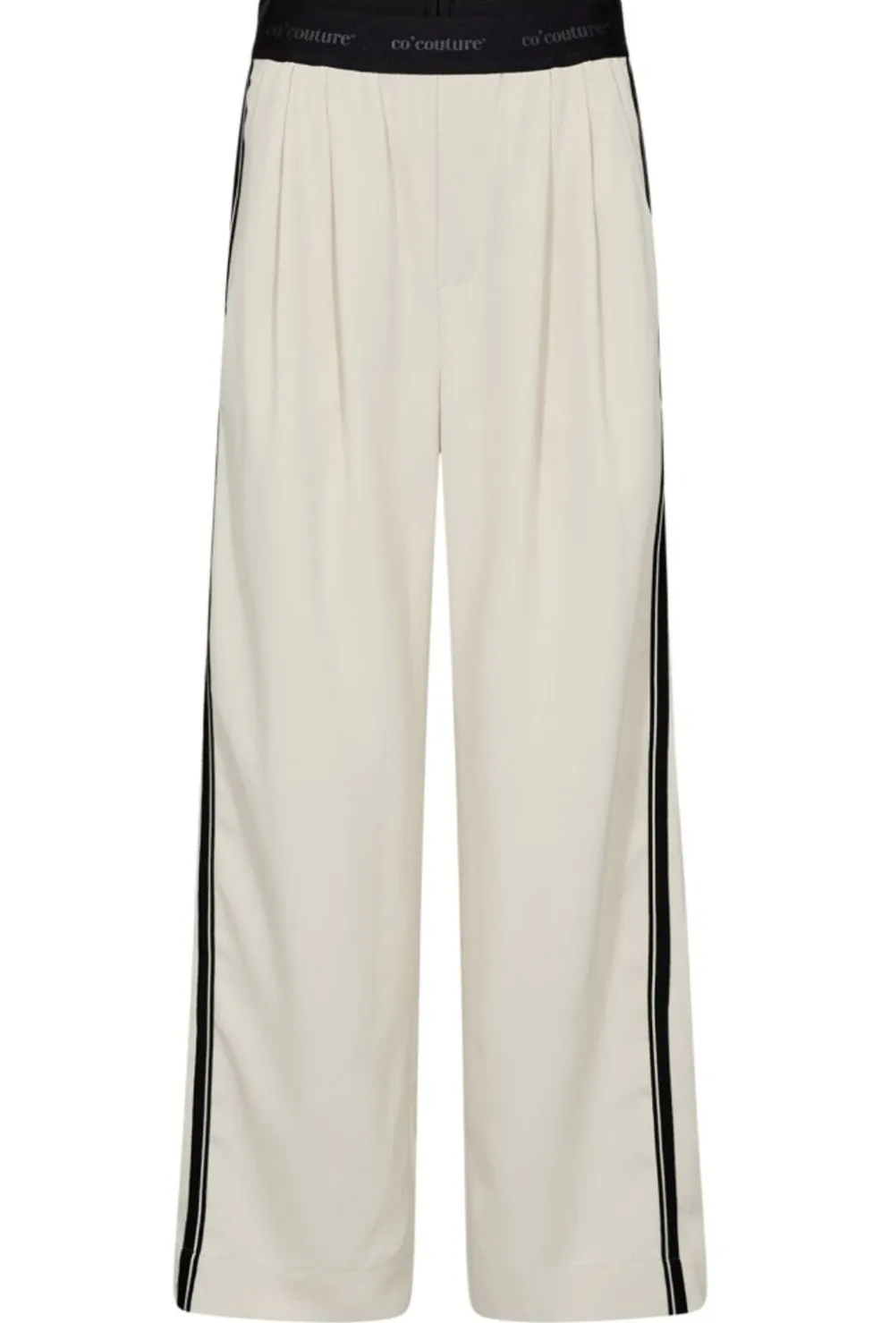 Bukser fra Co´Couture i en lys bone-farve. Bukserne har en løs pasform med sorte striber langs siderne og en bred elastisk linning med Co´Couture-tryk.