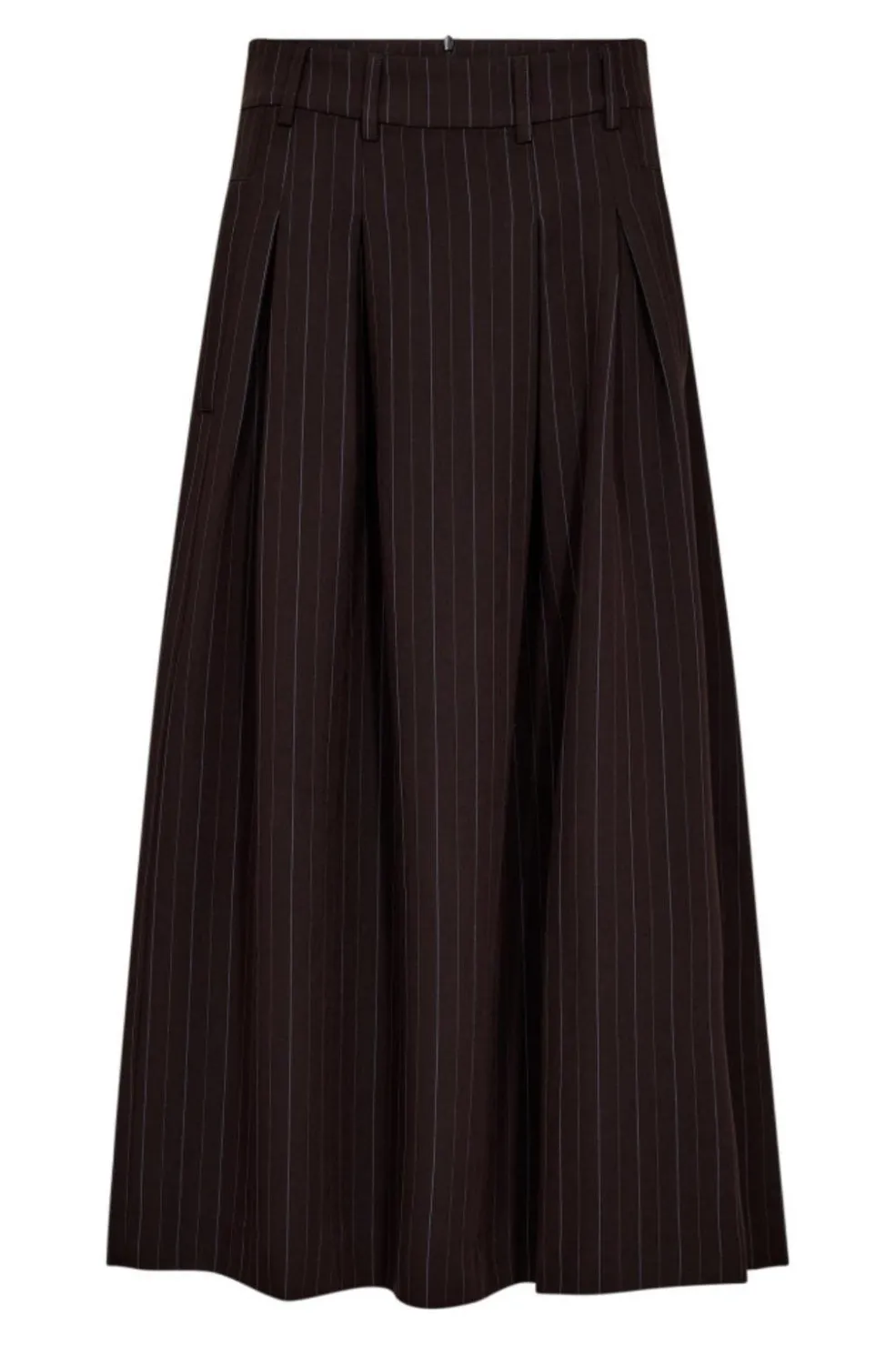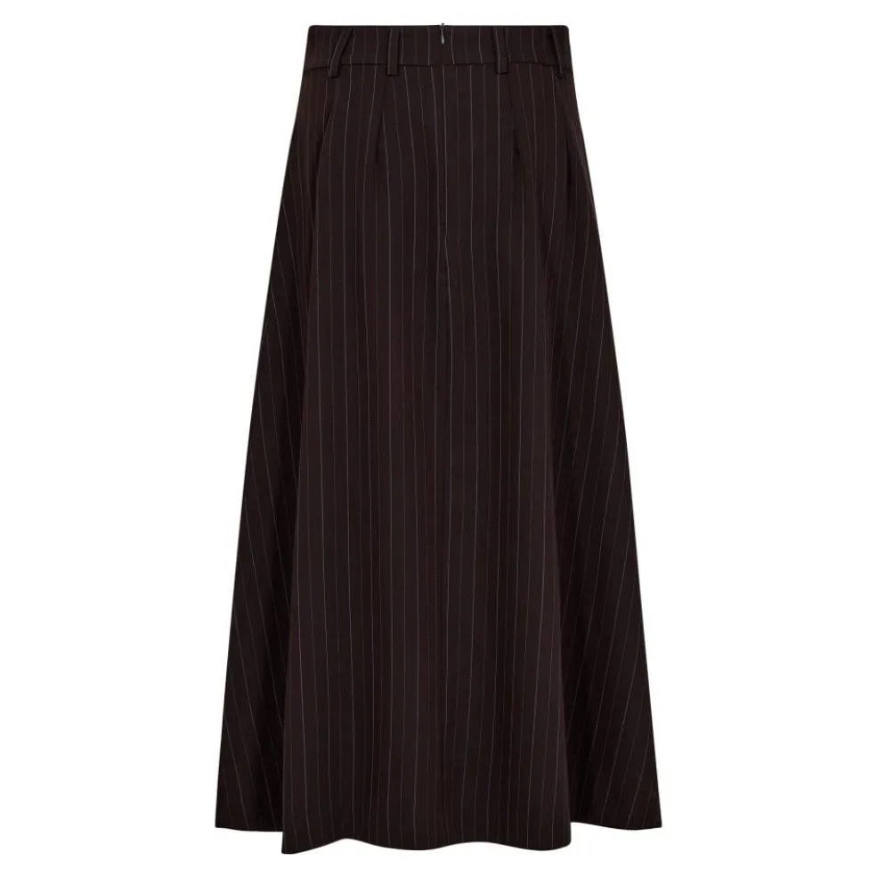 Plisseret nederdel fra Co´Couture i mørkebrun med lodrette striber. Nederdelen har høj talje og folder på siderne samt lommer.