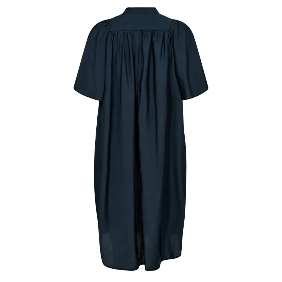 Mørkeblå kjole fra Co´couture med skjortekrave og knaplukning. Kjolen har plisserede detaljer og korte ærmer med volumen.