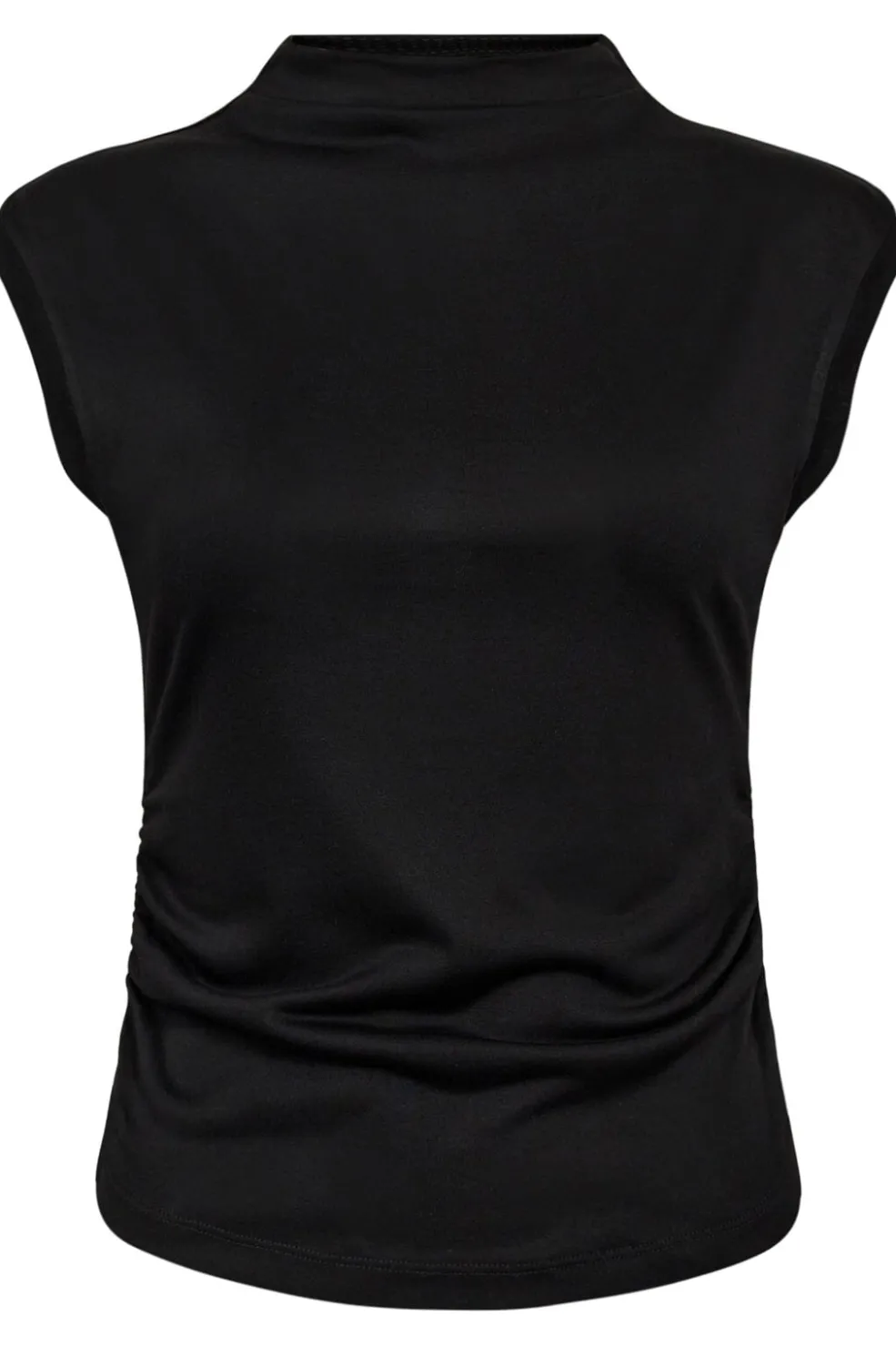Sort t-shirt fra Co´Couture med høj halsudskæring og ærmeløst design. Rynkedetaljer i siderne giver t-shirten et særpræg og en god pasform.