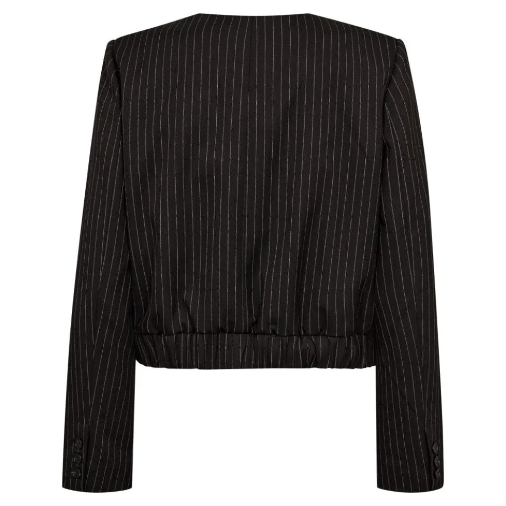 Mørkebrun bomberjakke fra Co’Couture med nålestribet mønster. Jakken har en rund halsudskæring uden krave og lukkes med tre knapper foran.