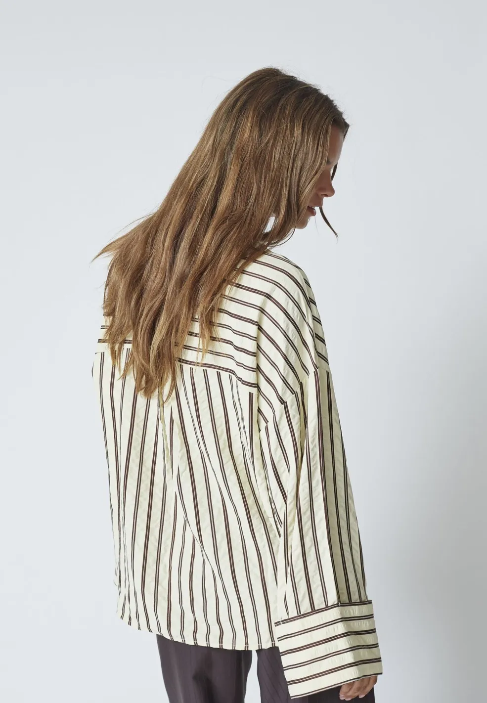 Stribet skjorte fra Co´Couture med lodrette striber i brune og hvide nuancer. Skjorten har en klassisk krave og brede ærmer med rynkedetaljer.