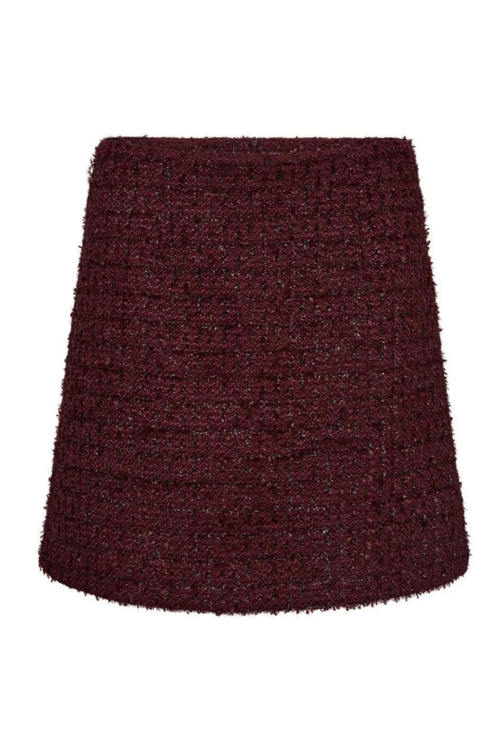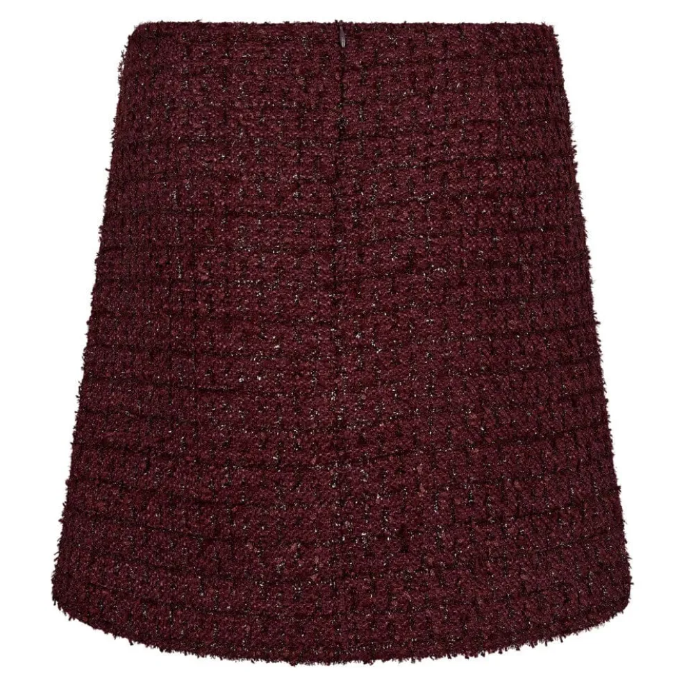 Kort nederdel fra Co’Couture i en mørk blommefarve. Den har en struktureret overflade med et meleret mønster og en lynlås på bagsiden.