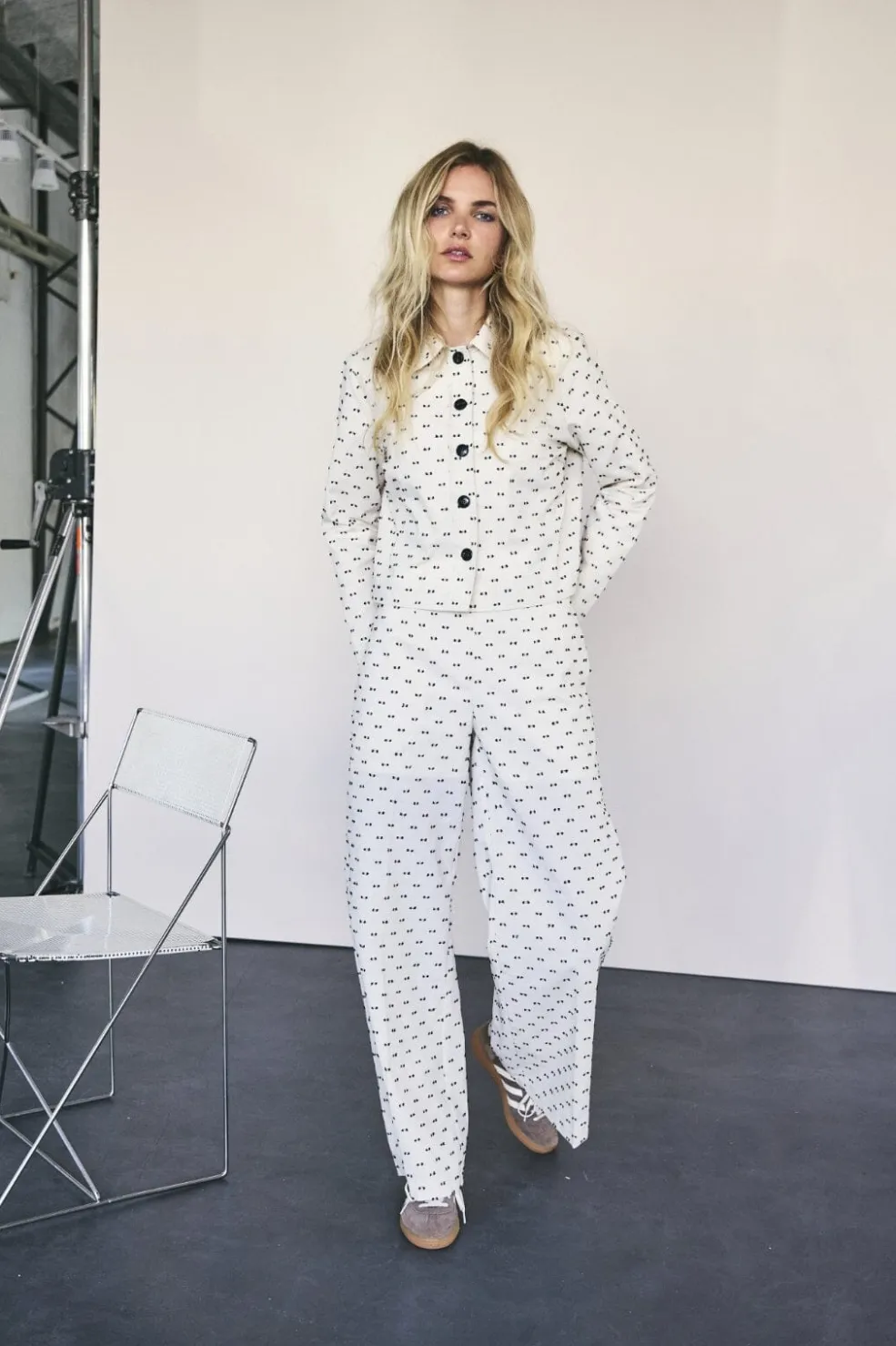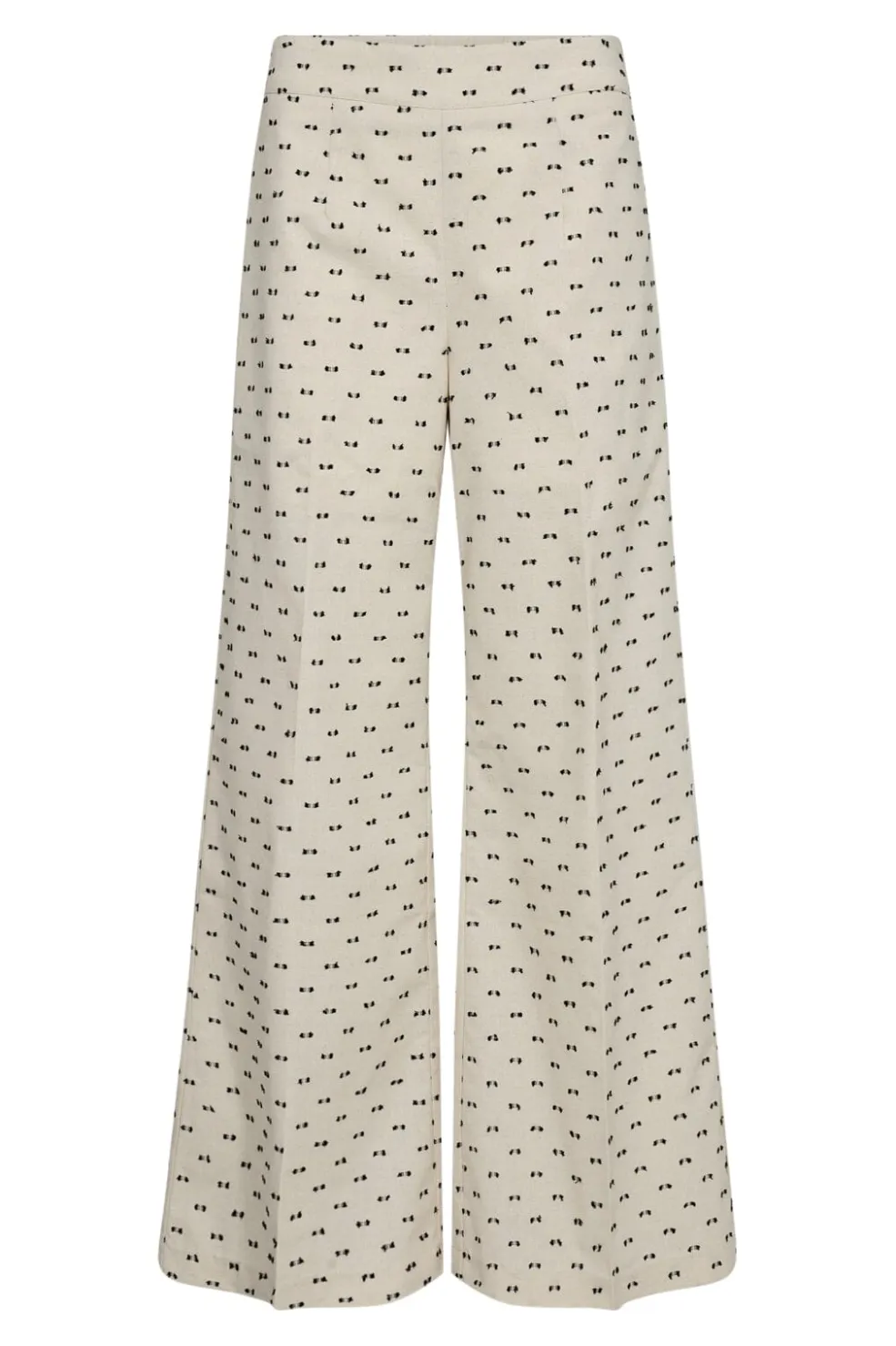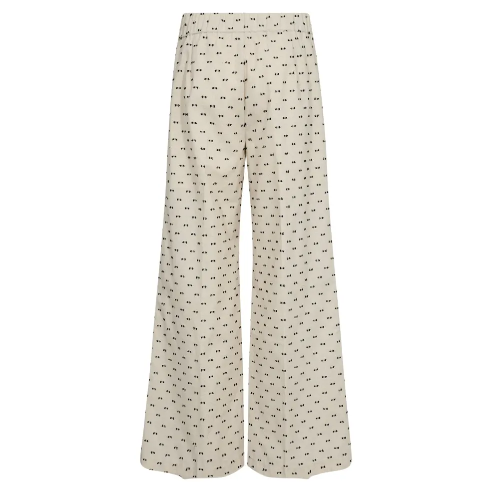 Bukser fra Co’couture med brede ben og print i off-white. De har små sorte figurer på den lyse baggrund og ankellængde. En afslappet model med behagelig pasform.