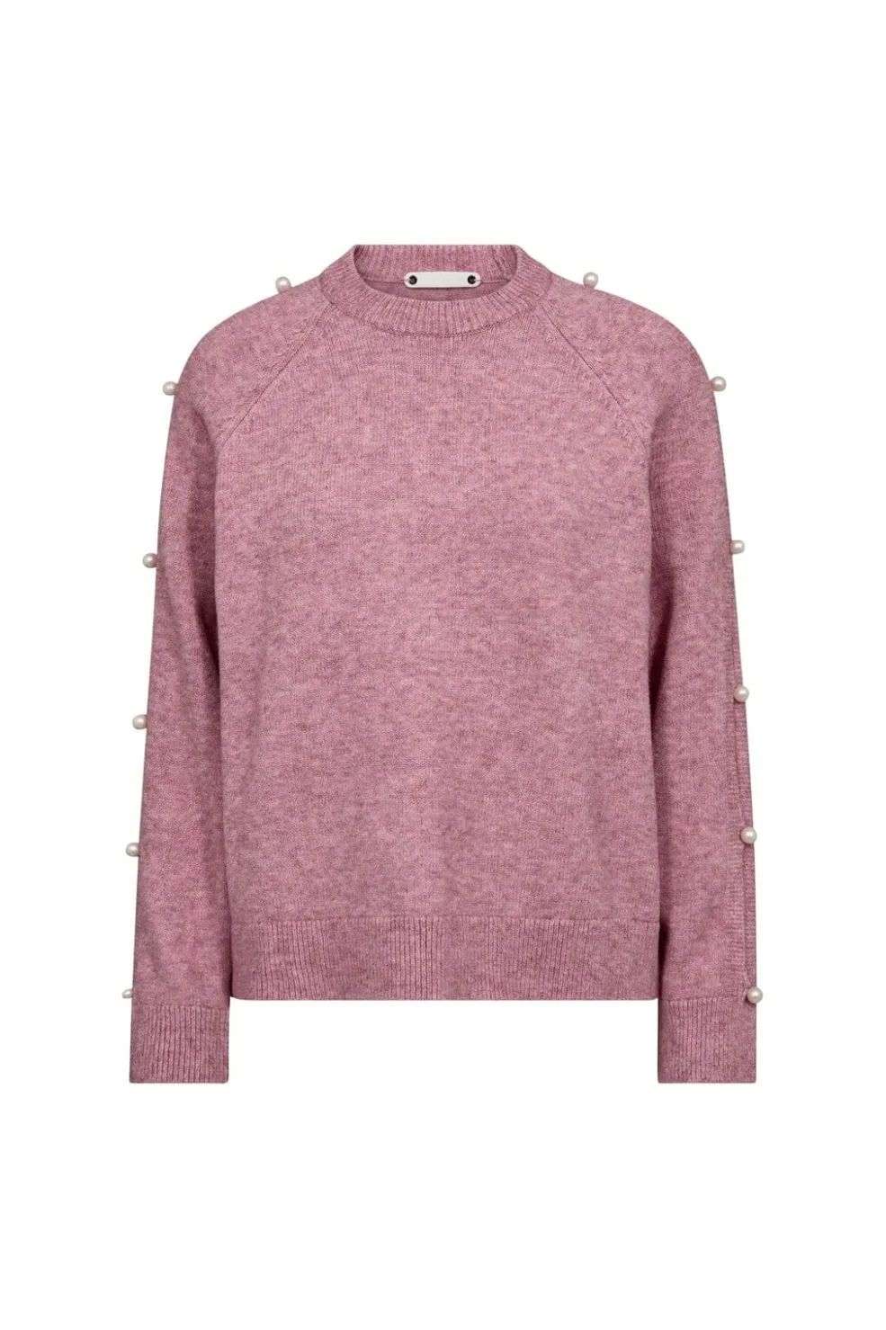 Lyserød strik fra Co´Couture med perledekorationer langs ærmerne. Sweateren har lange ærmer og rund halsudskæring. Den lyserøde farve har en meleret struktur med små lyse og mørke nuancer.