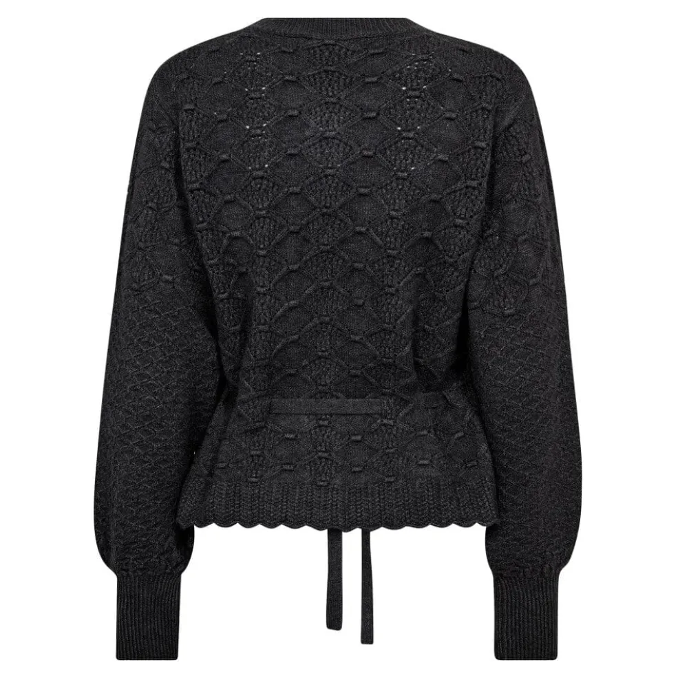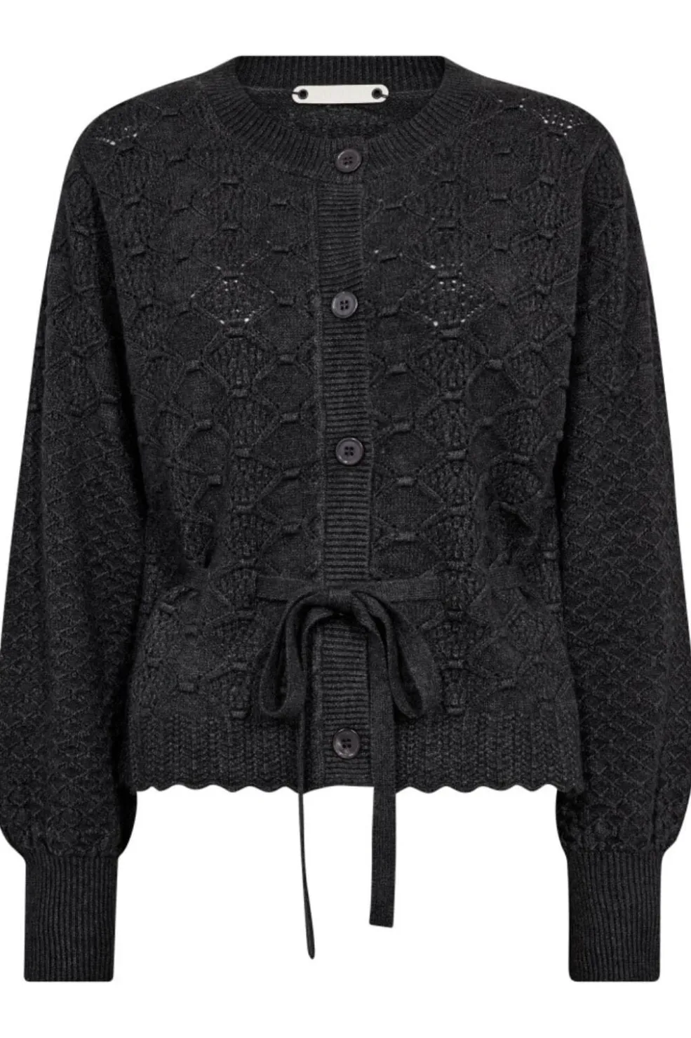 Mørkegrå cardigan fra Co’Couture med pointelle-mønster. Den har knapper foran og bindebånd i taljen. Ribstrikkede manchetter giver en god pasform ved håndleddene.